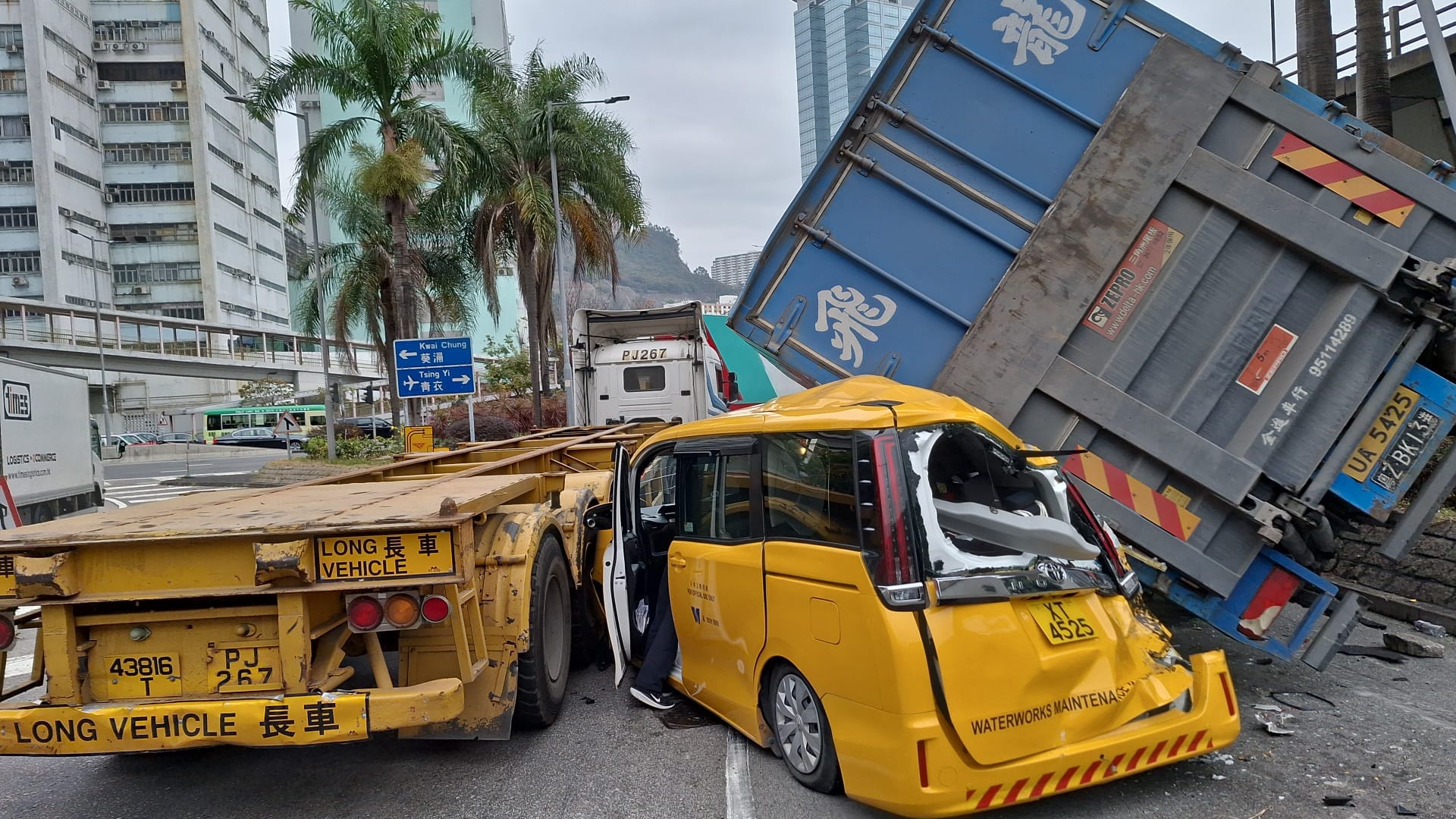 據悉,意外中3人受傷,其中貨車司機一度被困,由多名消防員開梯並爬上翻側的貨車車頂救出,由救護人員送院治理。警方正調查事故成因。