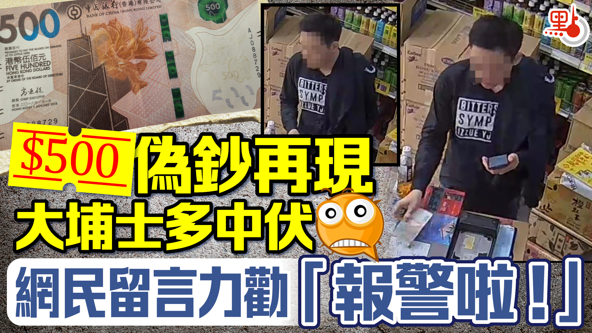 大埔一間士多日前在fb專頁「大埔人大埔谷」發帖,指於當日下午約2時,收到懷疑假$500元偽鈔,附有天眼影片截圖,指「小心此人用假五百蚊紙幣,如認識此人請代為通知佢本人於今天19:00前回來,否則報警處理!」