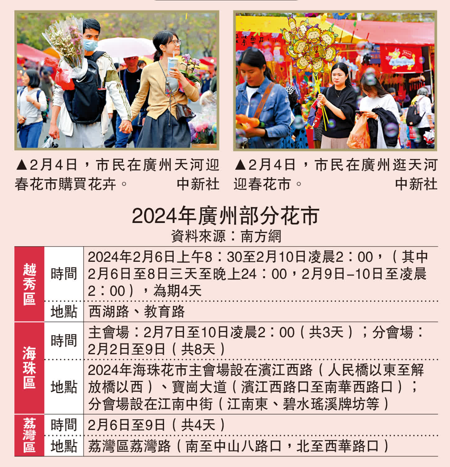 行花街、龍獅表演、藝術花市……「花城」廣州11個區按「一區一花市」模式集中舉辦迎春花市。廣州市越秀西湖花市圍繞「古越今秀,海絲花開」主題,花市主牌樓將繼續設置在西湖路廣場,延續「百年花市,源於越秀」的歷史傳承。荔灣區則重現水上花市,打造12艘以嶺南花卉、廣府文化為主題的特色花舫,邀請盛裝打扮的西關小姐乘着花舫在荔灣湖上巡遊賞春色、與遊人合影。