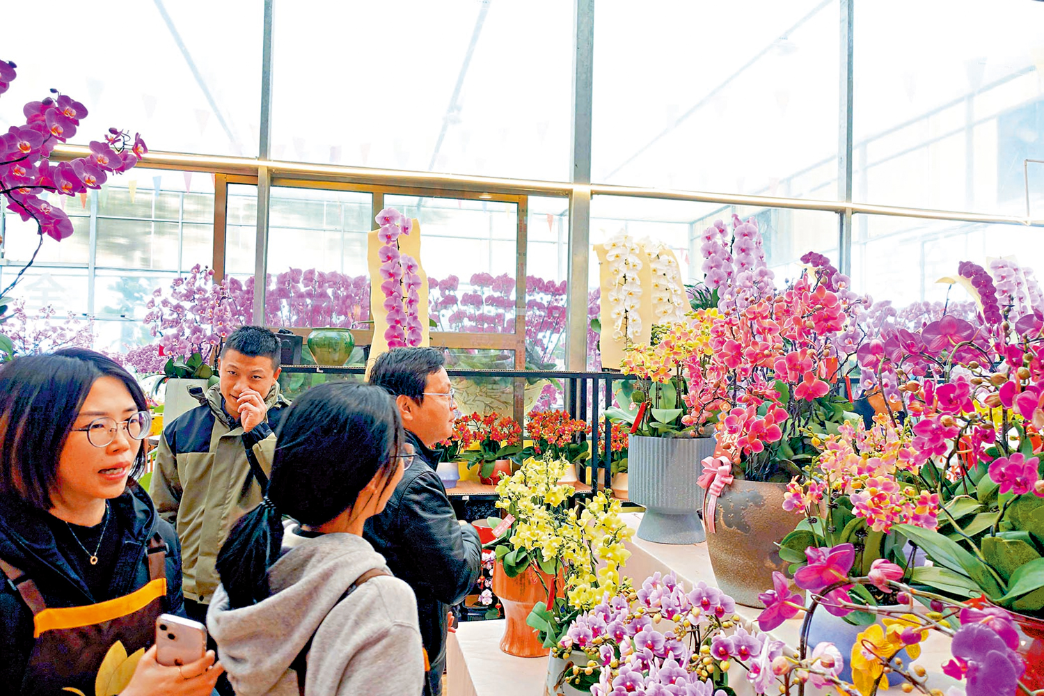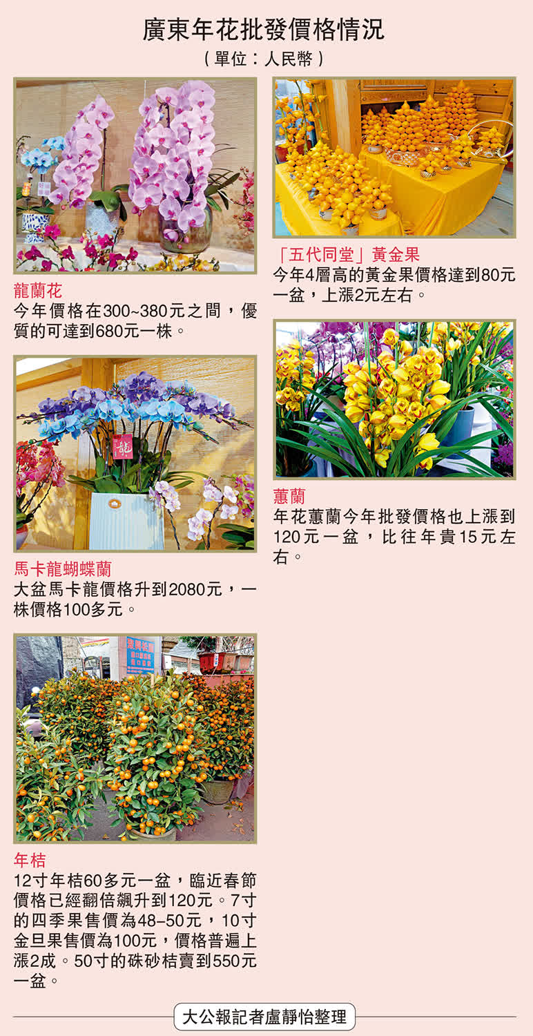 (大公報記者 盧靜怡)春節將至,年花飄香。港人向來有過年「行花街」的習俗,但新年年花又來自哪裏呢?記者近日探訪了華南地區最為知名的「陳村花市」和廣州嶺南花卉市場。順德陳村被譽為「千年花鄉」,香港有超過6成年花都來自這裏。多個在陳村種植和銷售供港年花超過20年的檔主表示,今年春節北上「買年花」提早火熱,無論是年桔還是蝴蝶蘭都銷售火爆,龍蘭、馬卡龍蝴蝶蘭也很搶手。不少香港客商更是提前一個月來豪邁採購。有花卉市場負責人更表示:「每一天至少有十幾輛車從花卉市場開往港澳。」