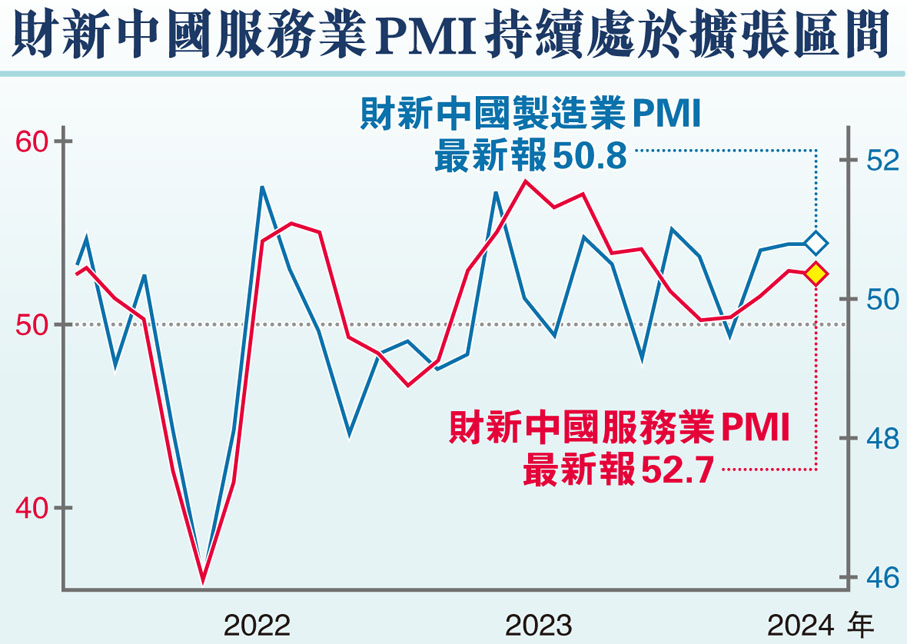 (香港文匯報記者海巖 北京報道)2024年開年,內地服務業穩步擴張,1月財新中國通用服務業經營活動指數(服務業PMI)為52.7,雖低於去年12月創下的近五個月高點0.2個百分點,但亦為近六個月來次高,並連續13個月處於擴張區間,服務業景氣度持續恢復。專家認為,春節臨近,企業生產經營進入淡季,價格疲軟、信心不足等仍制約經濟回升,貨幣、地產等政策有必要保持力度。