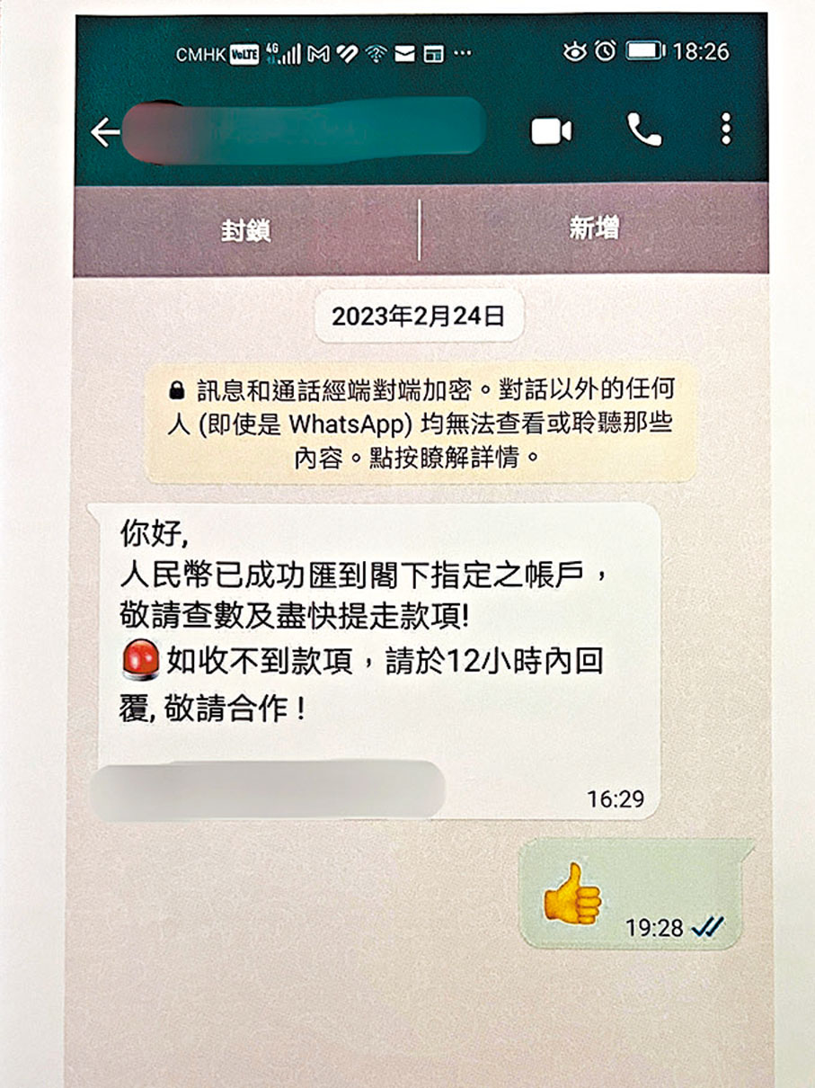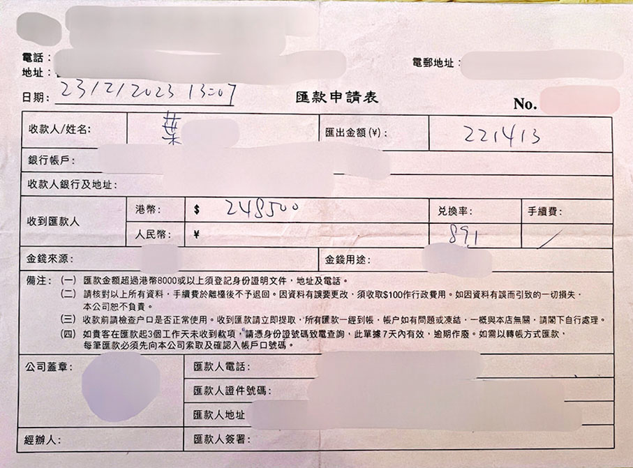 去年2月底,他透過香港一間幫襯過幾次的找換店匯款,翌日便兌換成22萬多元人民幣匯到他在內地的銀行戶口,店方事後還透過通訊平台通知已順利過數。由於香港和中山來往方便,裝修也不急於一時,葉先生直至翌月底才往中山提款,卻獲告知戶口遭凍結。