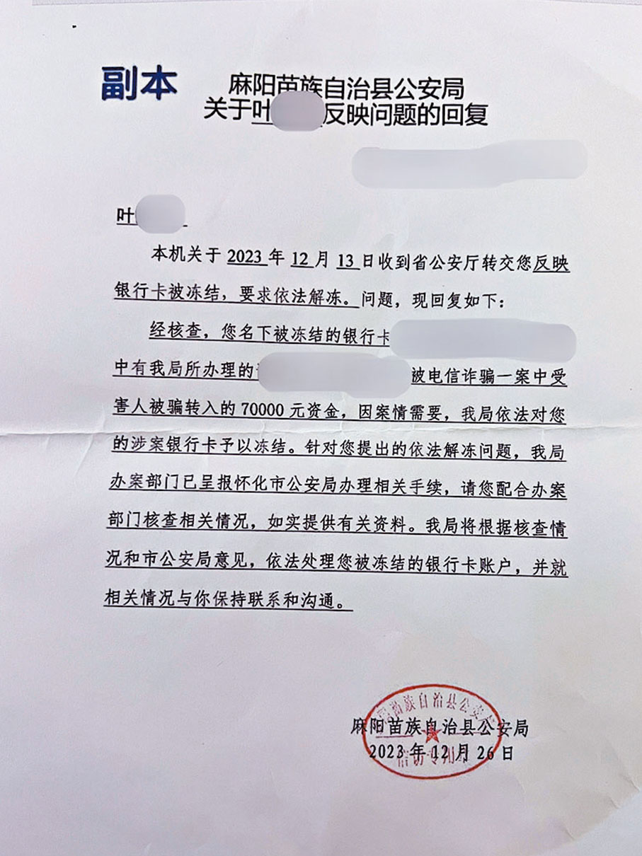 一時間不明所以的葉先生向銀行查詢凍結原因,對方稱「湖南省懷化市麻陽苗族自治縣公安局反詐中心刑偵大隊」把其戶口凍結。葉先生馬上訂高鐵車票及酒店,前往該間公安局,得悉其銀行戶口被凍結與一位唐姓女子有關,原來找換店在香港收到葉先生的款項後,不是攜帶該筆錢返內地存入其戶口,而是經由該名唐姓女子的私人銀行戶口,把22萬多元人民幣過數到葉先生的戶口,「但係呢位唐姓女子嘅戶口涉及非法洗黑錢,警方為調查案件,與該戶口有來往的賬戶全部被凍結,包括我的戶口。」葉先生說。