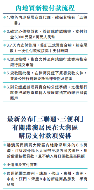 早前兩地公布《港澳居民購買粵港澳大灣區內地城市房產結算支付便利化業務指引》,但仍有諸多限制(見表),而且只適用於償還內地貸款(即供樓款項),首期匯款的癥結問題未解決。