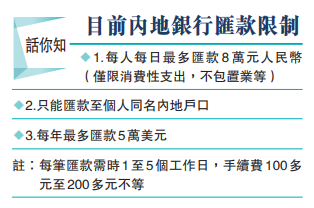 他解釋,找換店比銀行匯款更方便,手續費也較低,而且正規銀行有每年及每日匯款上限規定,「銀行匯款每日最多匯8萬人民幣,每年最多匯5萬美元(約39萬元人民幣),我要匯25萬就要分三日匯款,每次仲要幾百蚊手續費,又麻煩又唔抵,找換店就無這些限制,一次匯晒。」