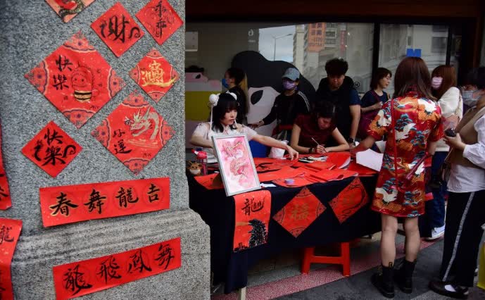 迪化街上春聯攤不少,有些是專門讓民眾自己動手寫,還有幾個年輕女孩搭了攤子,她們身着漢服,為人們現場創作創意春聯。