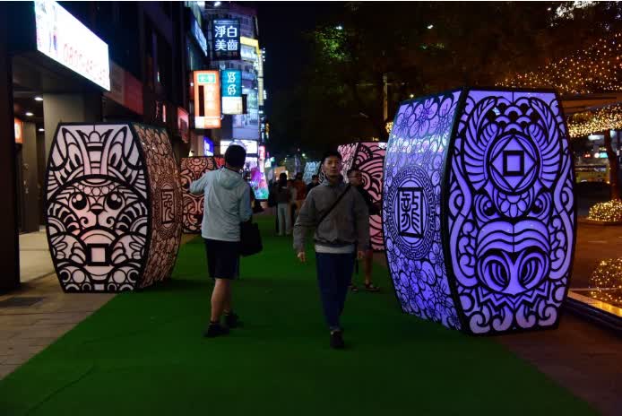 2月3日,人們走過「2024台北燈節」的「龍躍光城」展區。新華社甲辰龍年近了,台灣的年味濃了。日前,「2024台北燈節」的「龍躍光城」展區點亮。夜幕降臨,台北捷運西門站至北門站一帶,華燈構築出「光廊」。不同造型的龍燈,吸引許多市民駐足拍照。