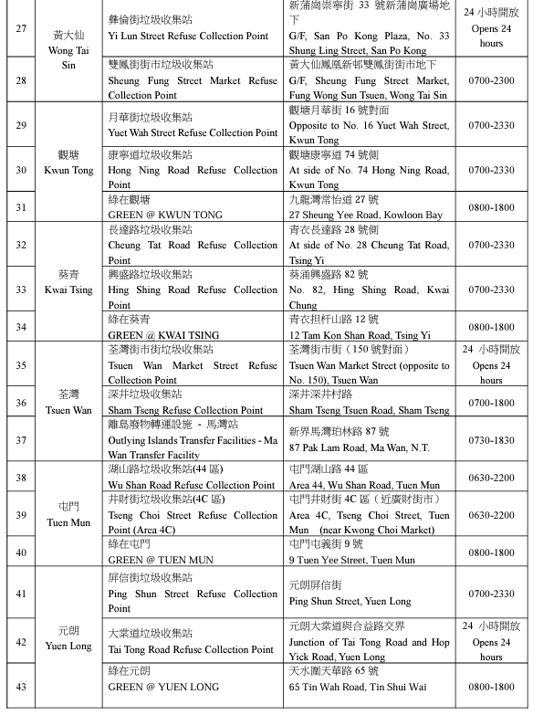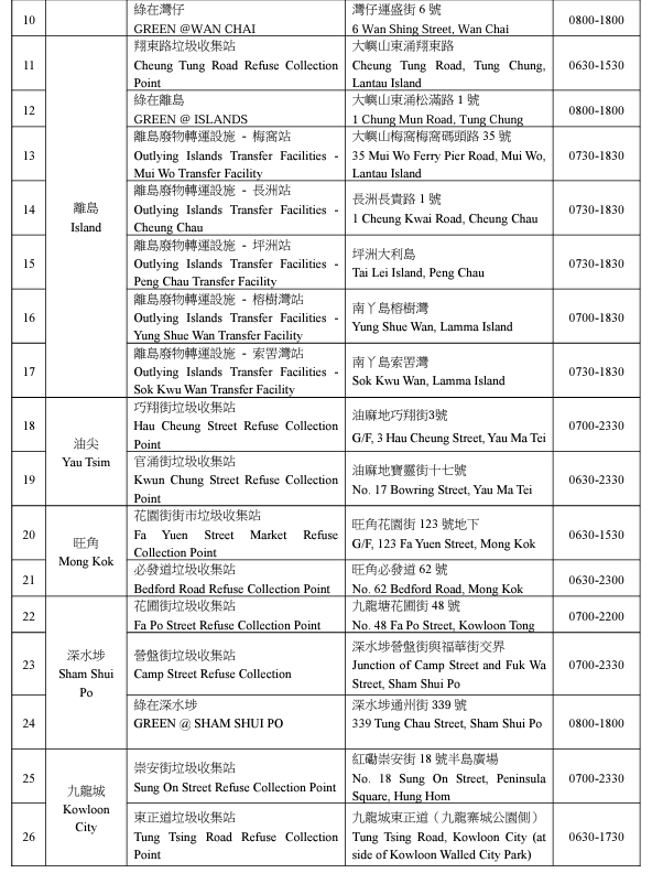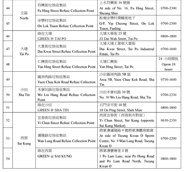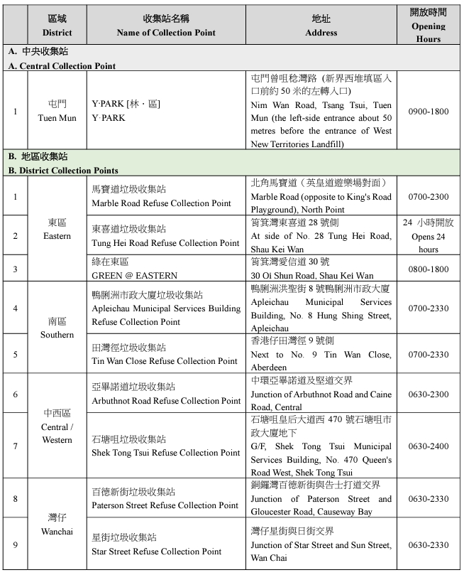 收集地點:位於Y·PARK[林·區]的中央收集站及54個地區收集站(包括「綠在區區」11個回收環保站、6個離島廢物轉運設施及37個公眾垃圾收集站)。有關收集點的位置及開放時間如下: