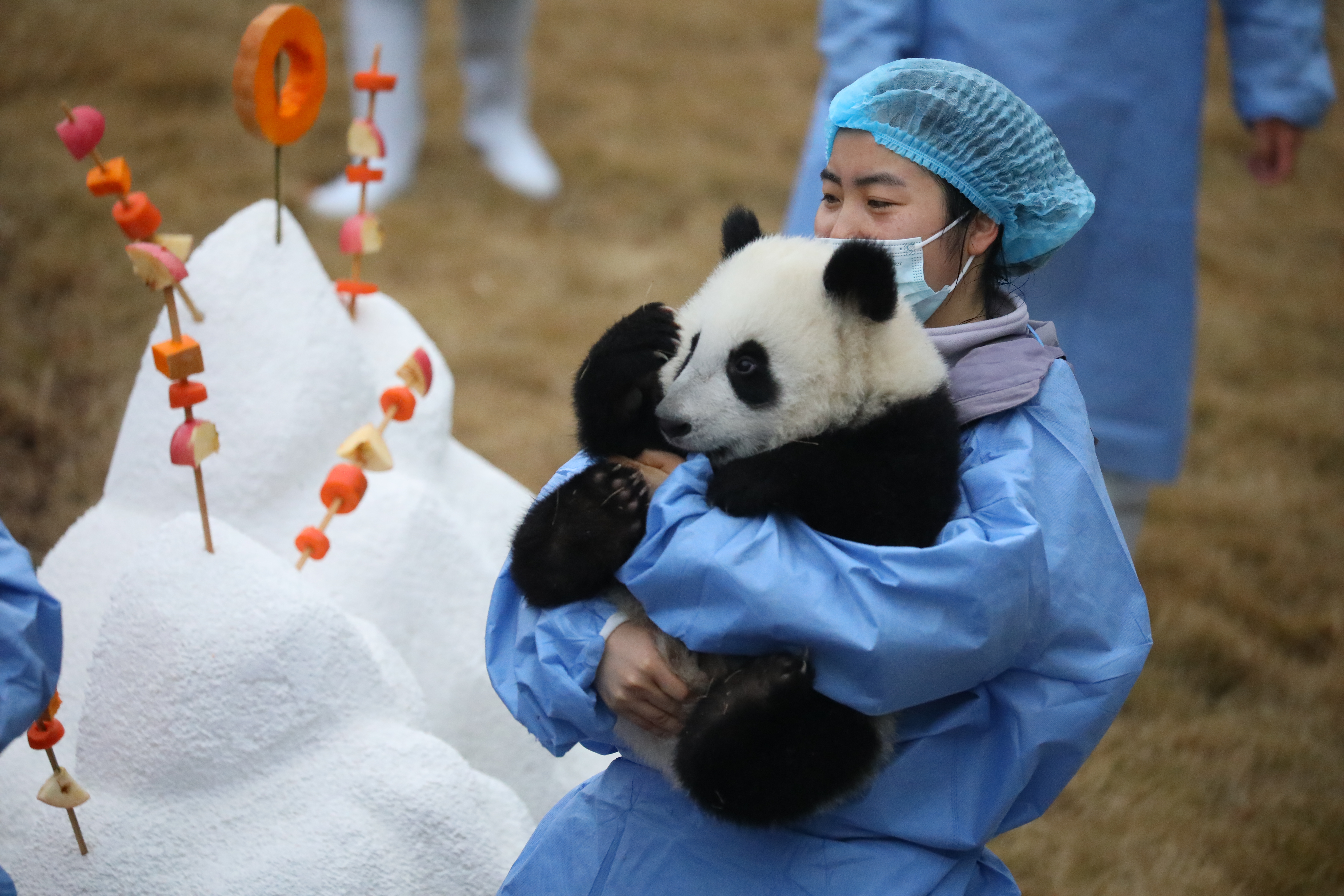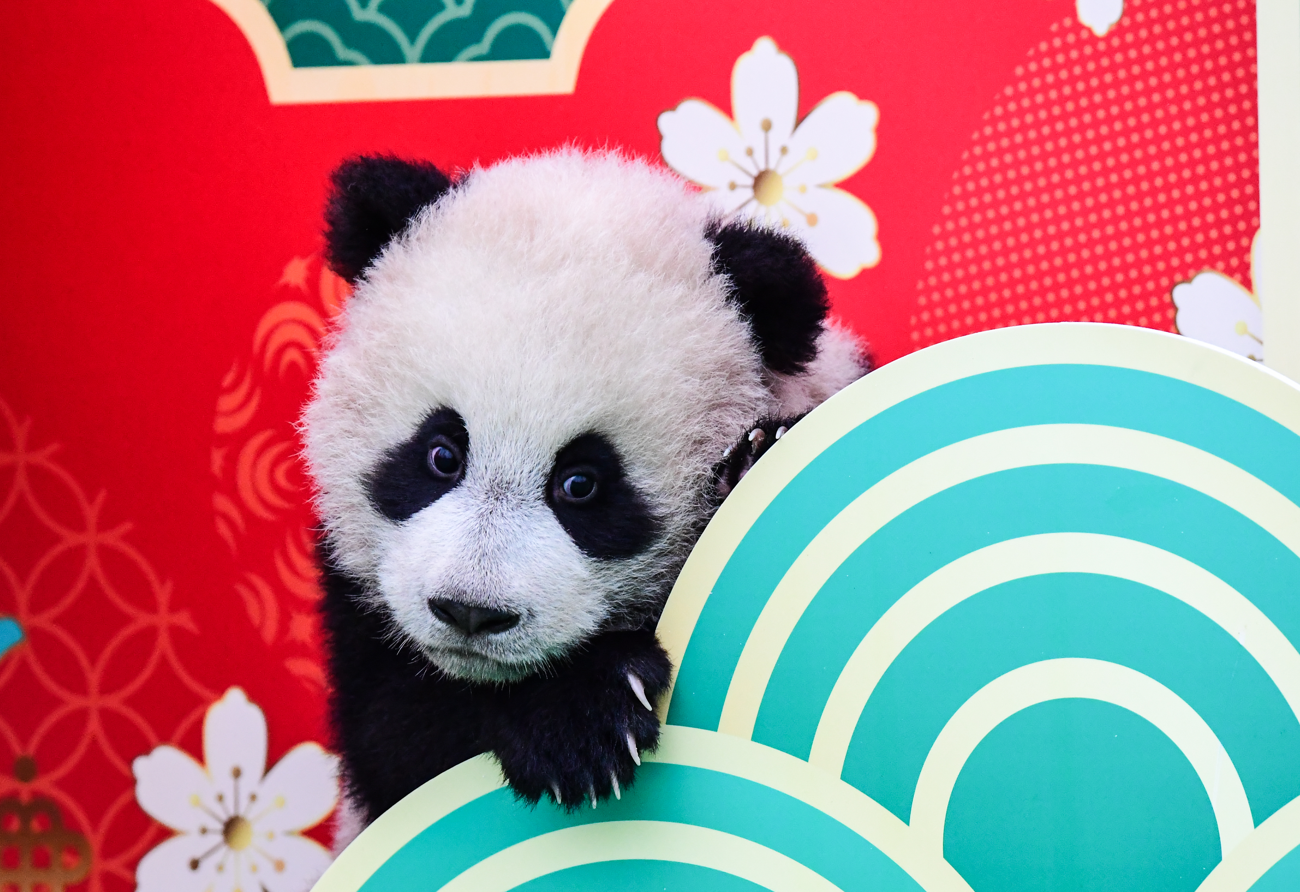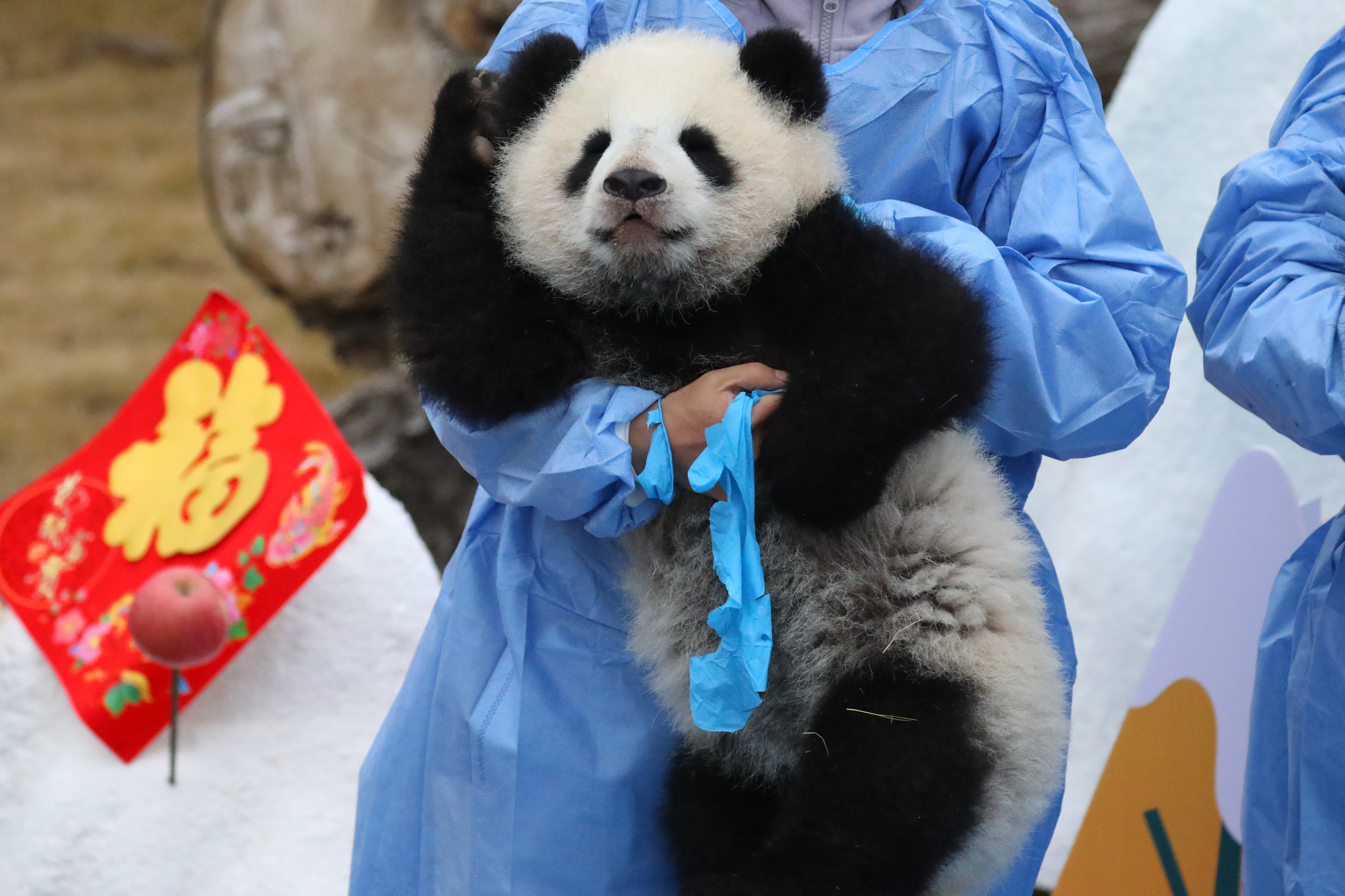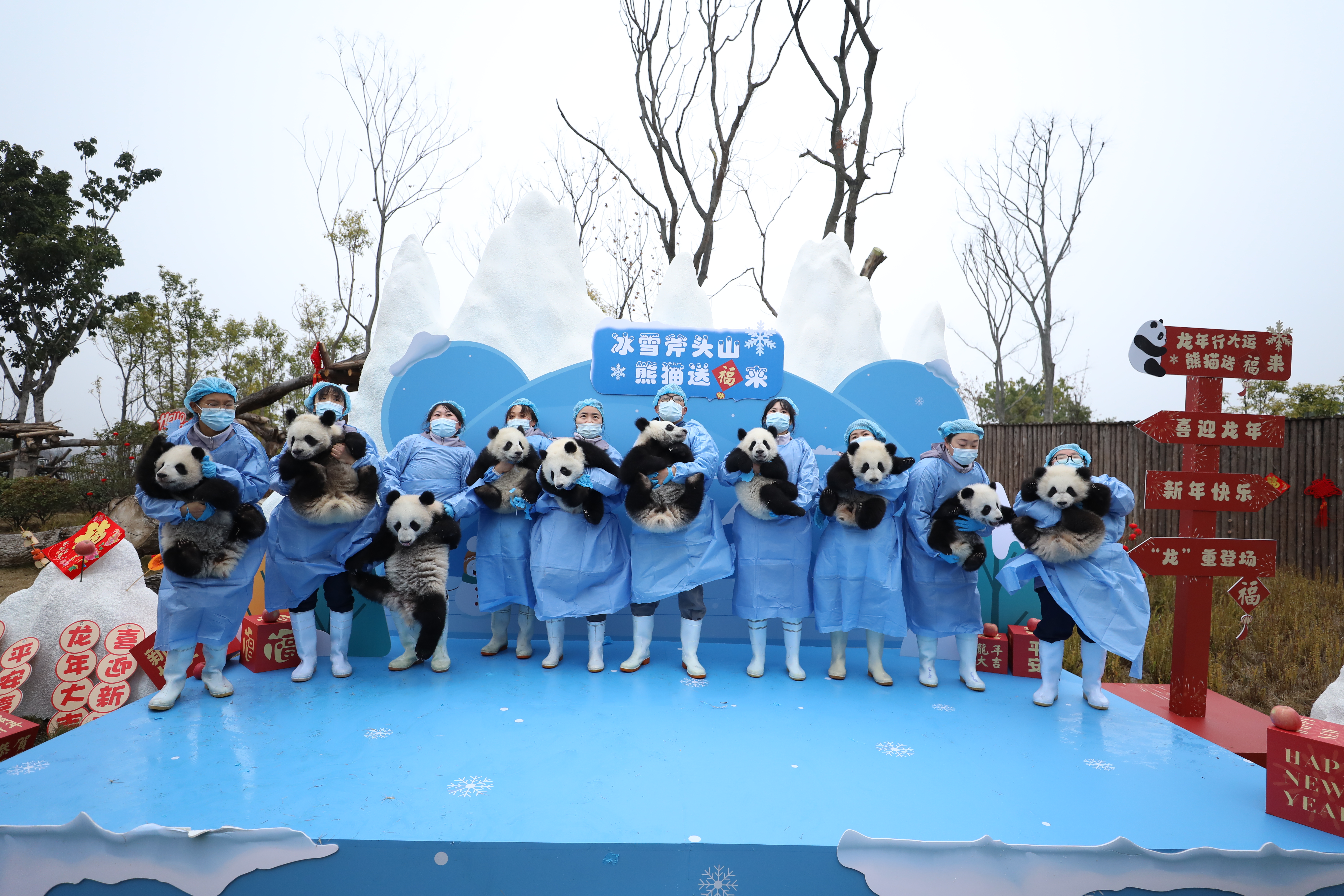 2023年熊貓中心和熊貓基地共成功繁育大熊貓34只,這些「糯米糰子」一亮相,就讓人挪不開眼。熊貓中心的展台位於臥龍神樹坪基地,主打「中國風」,以「中國紅」為主背景,設置了中國結、鞭炮、龍舟、龍形象的公仔裝飾;熊貓基地的展台位於北湖片區星星產房,以「冰雪斧頭山」為主題,布景以藍白色為主,背景板繪有雪人和雪花圖案,四周設置了雪山造型,整個場地充滿了「冰雪樂園」的氛圍感。