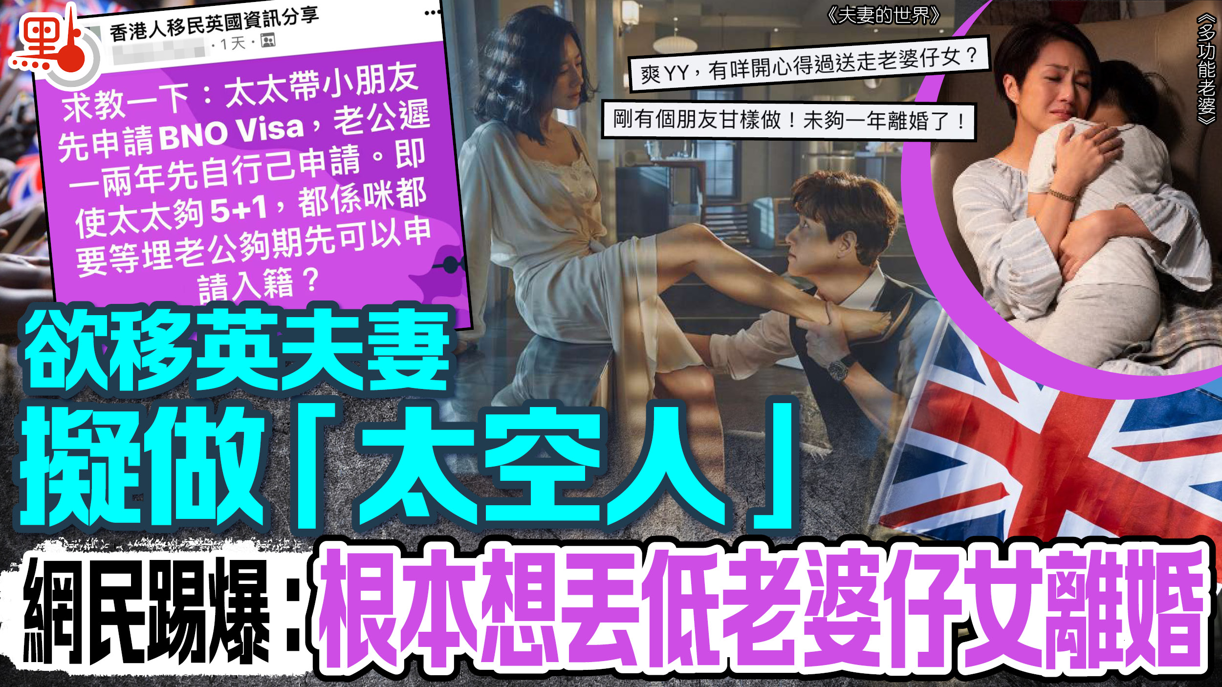 大公文匯全媒體報道,有港人家庭計劃以「太空人」方式移民英國,叫妻兒做先頭部隊,港爸則遲一兩年先動身。有網民斷定當中一定有古惑,指「爽YY,有咩開心得過送走老婆仔女?」、「正呀!老婆帶埋d麻煩細路終於走,終於拎返失去咗好好年嘅自由」。