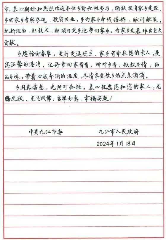 美國贛商聯合會會長李少華說:贛鄱連五州,華人一家親!很高興收到家鄉領導的龍年家書、喜慶剪紙。月是故鄉明,家書抵萬金。祝九江市在高標準建設長江經濟帶重要節點城市中突飛猛進、日新月異、再展宏圖!