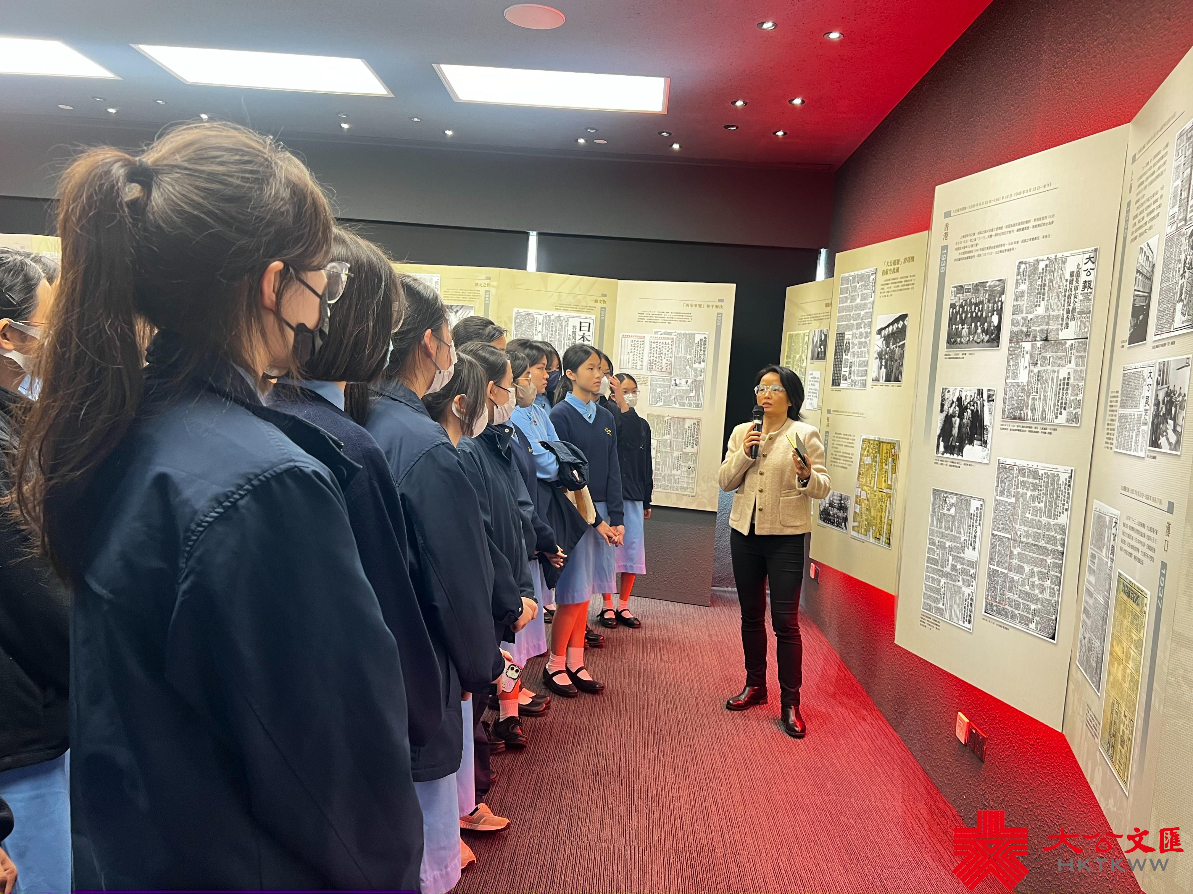 報史館分為《大公報》報史和香港《文匯報》報史兩部分。大文集團發行運營和品牌推廣中心助理總經理白蘭欣向同學們介紹,《大公報》創刊於天津,創辦人是英斂之,報刊的風格是愛國的、嚴肅的,以及1938年港版《大公報》創刊。同學們了解《大公報》如何推動歷史進程。例如,在西安事變中,通過發表重要社評,推動了西安事變和平解決和抗日統一戰線建立;在重慶談判後,《大公報》總編與毛澤東、周恩來、董必武等黨領導人會面,獲得毛澤東題詞「為人民服務」。走到《文匯報》報史館部分,白蘭欣介紹《文匯報》創刊於1938年,香港文匯報創刊於1948年9月。