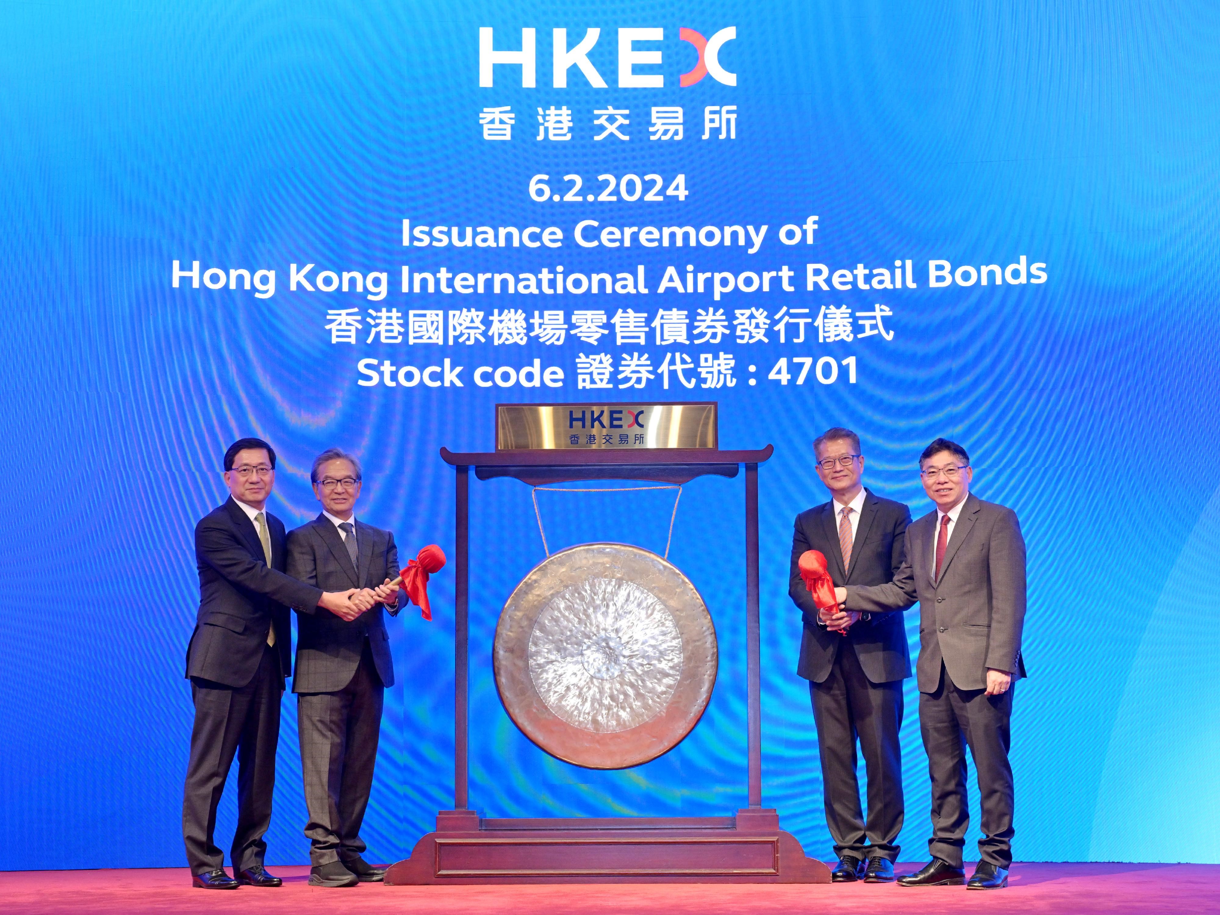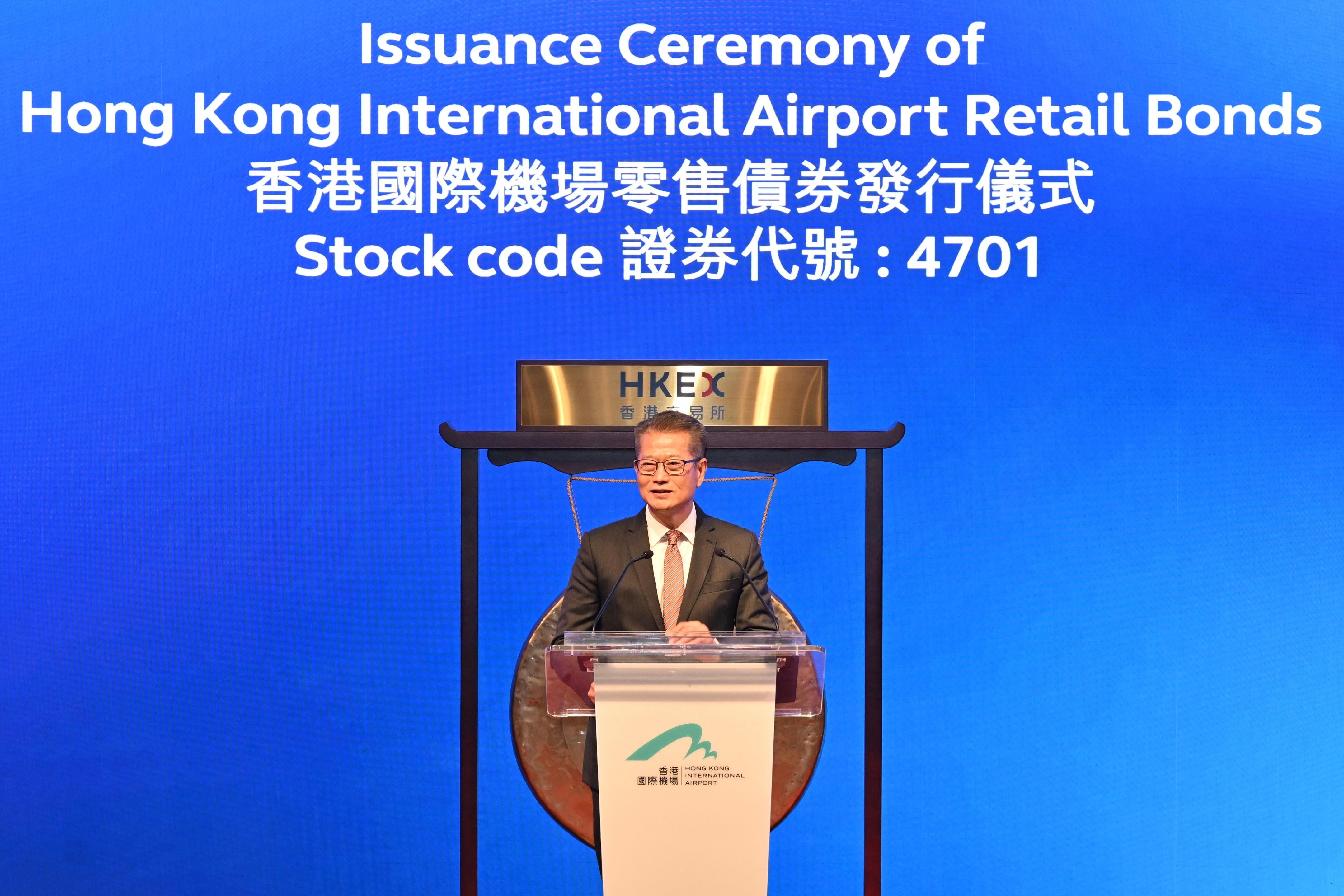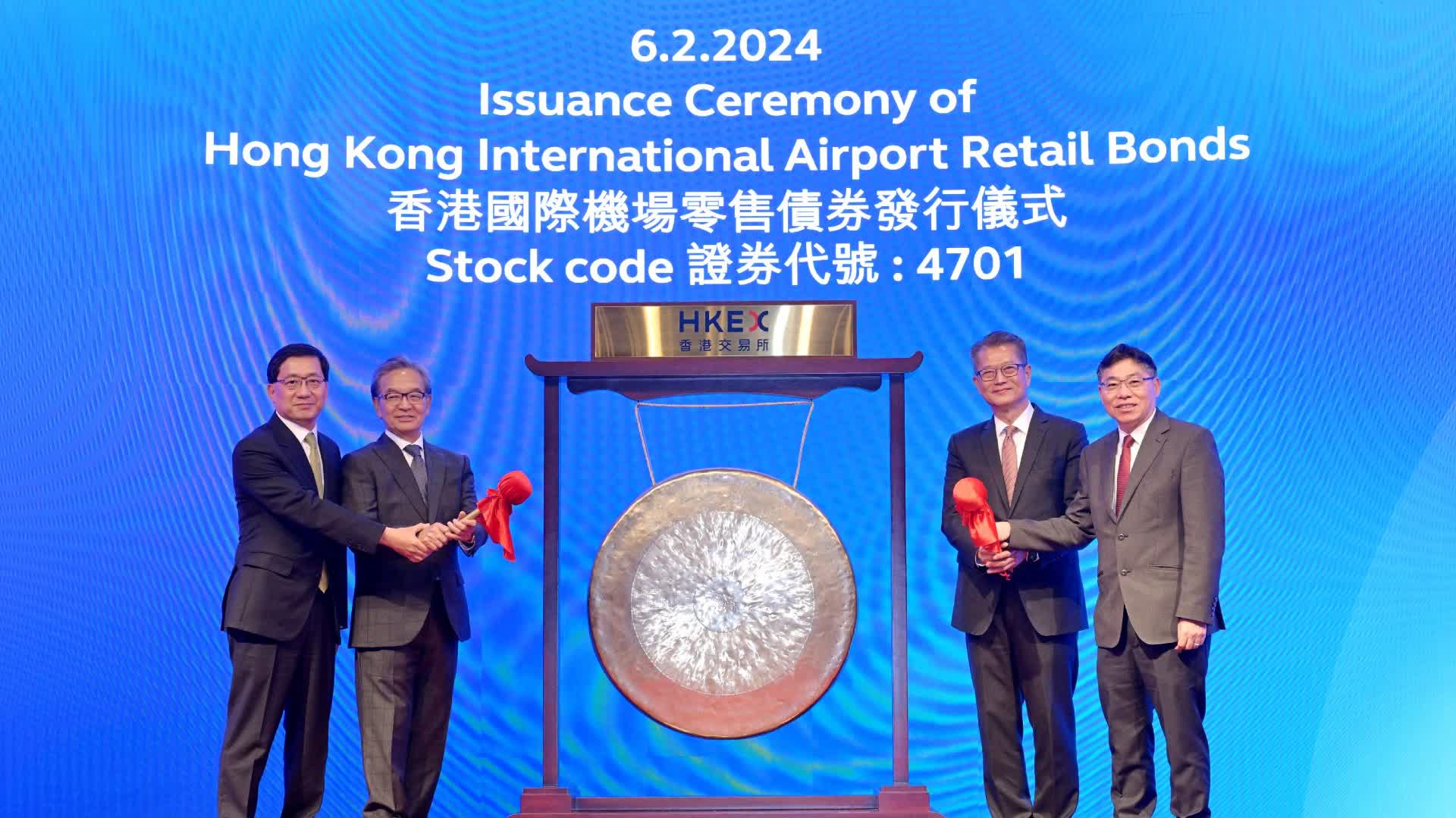 大公文匯全媒體報道,俗稱「三跑債」的機管局零售債券/機場債券今日(6日)在港交所掛牌上市,財政司司長陳茂波出席發行儀式致辭時形容具有標誌意義,希望在目前的環境下能為市民提供回報穩定的投資選項,同時也為日後其他大型公共建設項目在社會上進行融資提供有用的參考。