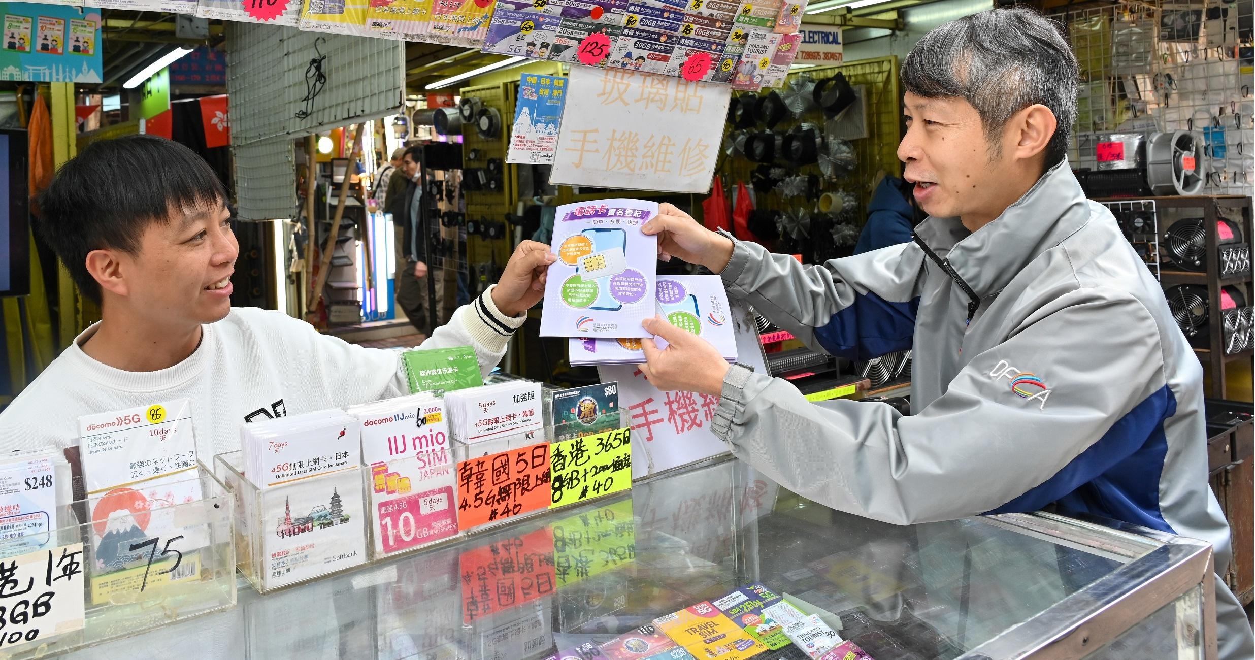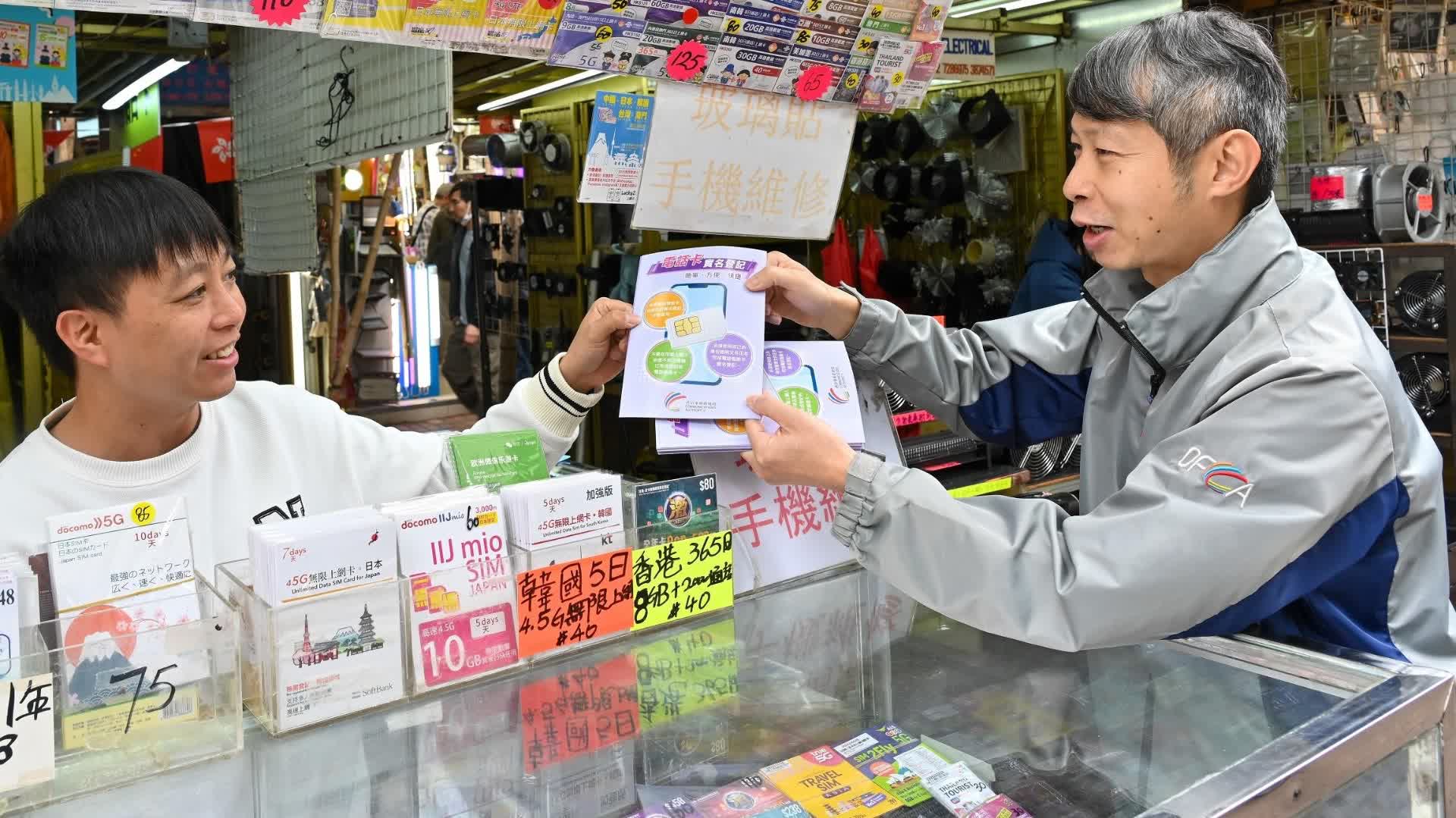 發言人說,為加強公眾對電話智能卡實名登記制的了解及確保商戶落實登記要求,通訊辦持續進行市場巡查行動及宣傳教育,提醒市民及旅客必須使用自己的身份證明文件正本進行實名登記,切勿購買或轉售已登記的電話儲值卡,以保障自己的權益,避免蒙受損失及需負上刑責。同時,通訊辦呼籲商戶切勿協助任何人使用第三者的身份證明文件進行實名登記,亦不可兜售聲稱已完成登記的電話儲值卡。