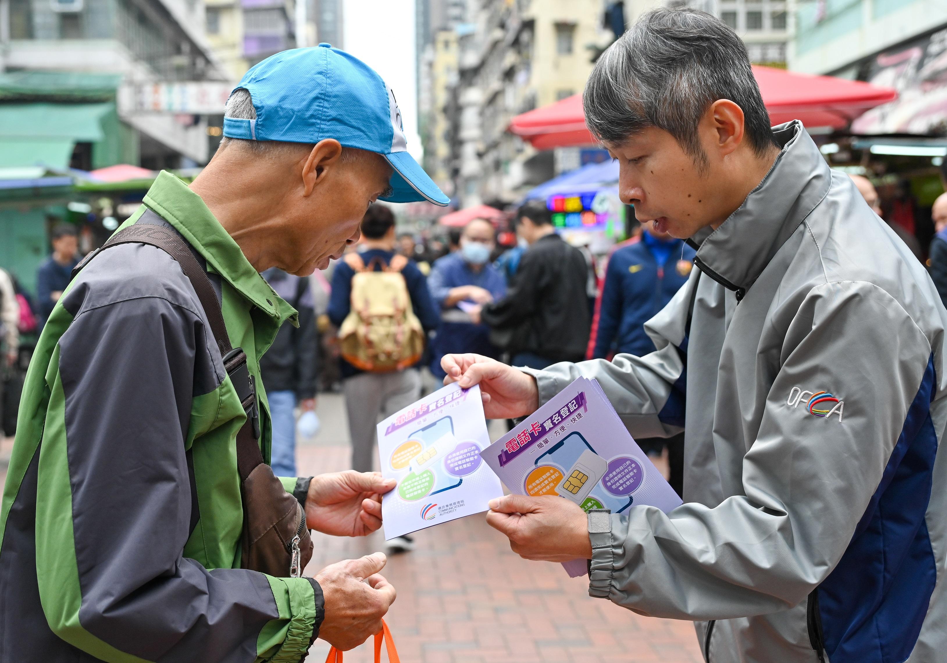 大公文匯全媒體報道,通訊辦今日(6日)在深水埗鴨寮街一帶進行農曆新年前的市場巡查及宣傳教育活動,向公眾和商戶派發傳單,提醒他們切勿售賣、購買或使用來歷不明或聲稱已完成實名登記的電話儲值卡。