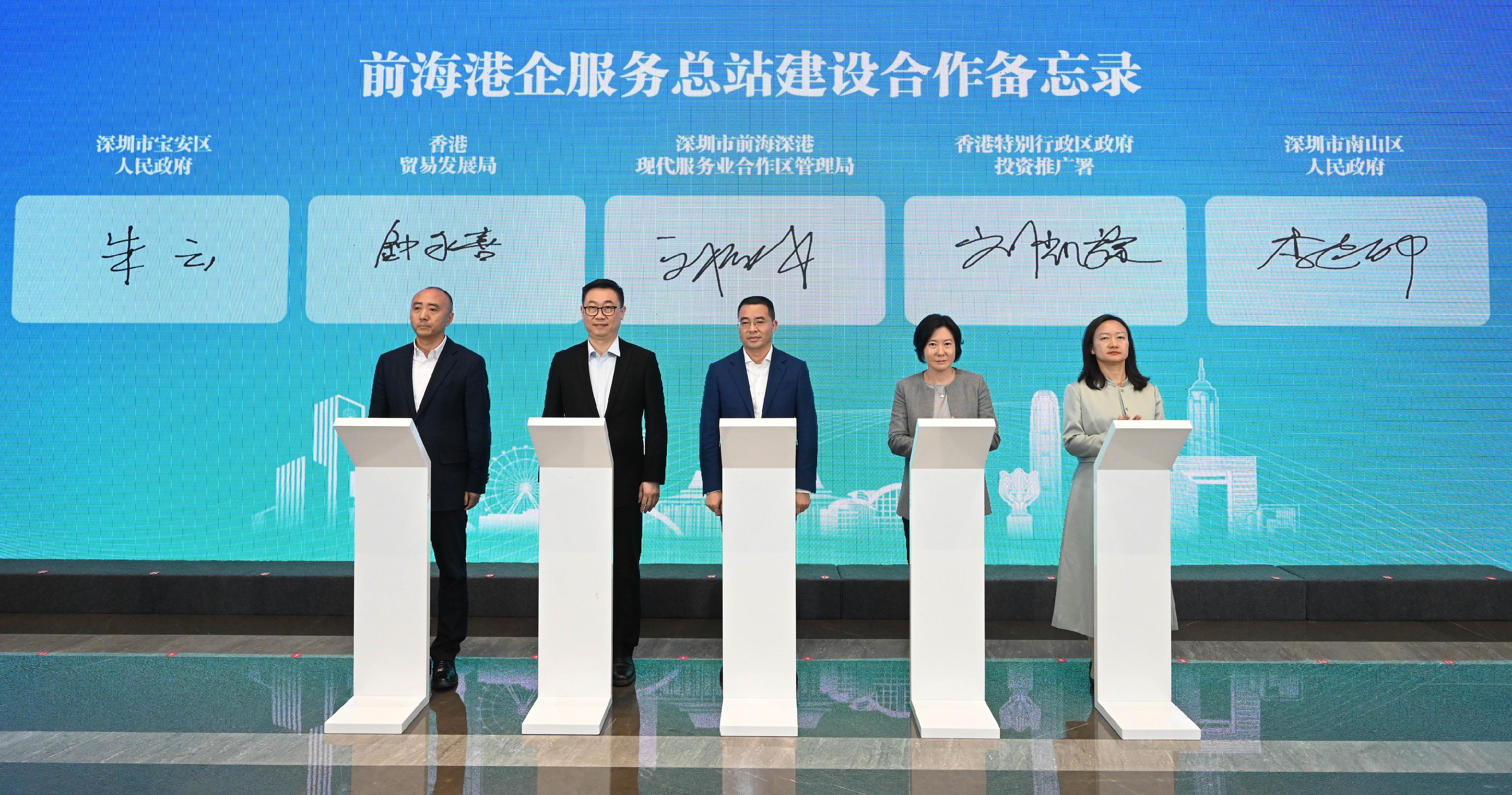 此外,深圳市前海管理局聯同香港投資推廣署、香港貿易發展局、深圳市南山區及寶安區政府,在會上簽署合作備忘錄,共同合作設立「前海港企服務總站」,為港人港企在深圳前海創業、投資、生活等提供一站式服務。