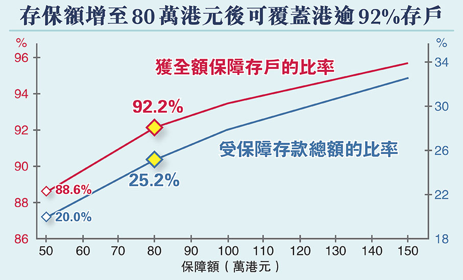 存保會去年發布的諮詢文件還就優化存保計劃提出一系列的政策建議,除將保障額由現時的50萬元提高至80萬元外,還提出完善供款機制、加強銀行合併時存款保障、擴大展示計劃成員標誌的規定至數碼渠道,以及簡化對私人銀行客戶有關不受保障存款的負面披露規定等。按照建議,若存款保障額由50萬元提升至80萬元,獲全額保障存戶會由約2,040萬存戶,增至2,123萬存戶,佔存戶總數的92%;而受保障存款總額估計由現時約2.6萬億元,增至約3.3萬億元,佔銀行體系總存款的25%。