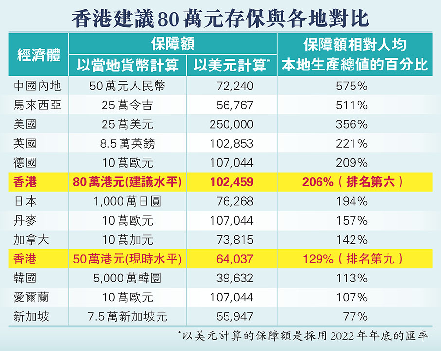 根據存保會諮詢文件資料,對比其他經濟體,香港的存保額與歐洲主要國家如英國、德國、丹麥及愛爾蘭的水平相若,折算同為約10萬美元,但就較美國的25萬美元少近60%。