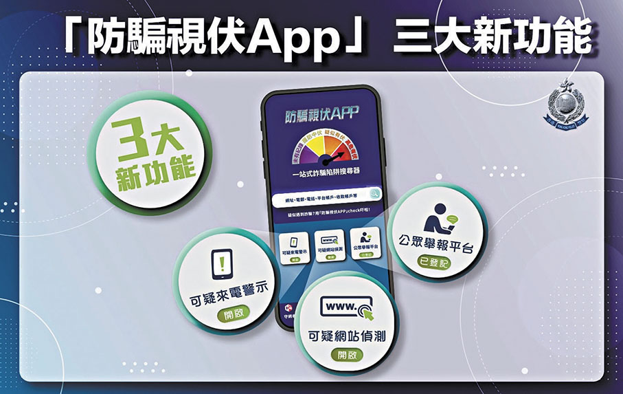 「防騙視伏App」亦將於2024年2月推出3個新功能,加入自動化元素,包括第一:「可疑來電顯示」及第二:「可疑網站偵測」,當用戶瀏覽可疑網站,或接收到可疑來電時,應用程式便會發出警示,提醒用戶,以防受騙;至於第三個新功能:「公眾舉報平台」,市民可以透過應用程式直接舉報可疑電話號碼或網站,進一步豐富資料庫的內容。