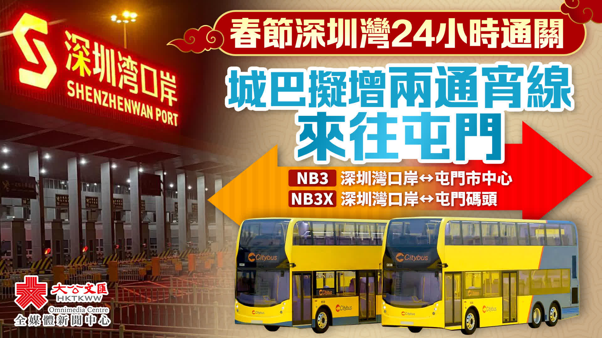大公文匯全媒體報道,農曆年三十至年初四(2月9日至13日)期間,深圳灣口岸將實行24小時運作,包括旅客及車輛。城巴早前宣布,為配合相關措施,將首次開辦通宵巴士NB3系列路線。