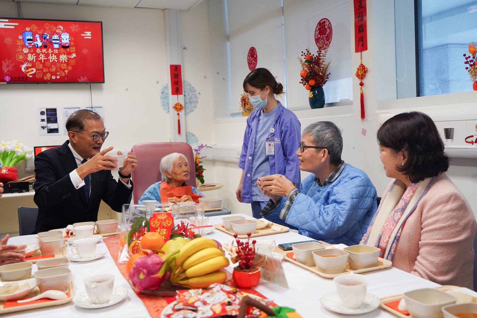 盧寵茂和李夏茵到病房向住院長者提早拜年送福,送上冷帽和十字繡飾物。大家又一同享用醫院特備的賀年食物,品嘗為吞嚥有困難病人而設的蘿蔔糕軟餐,與病人一起過早年。