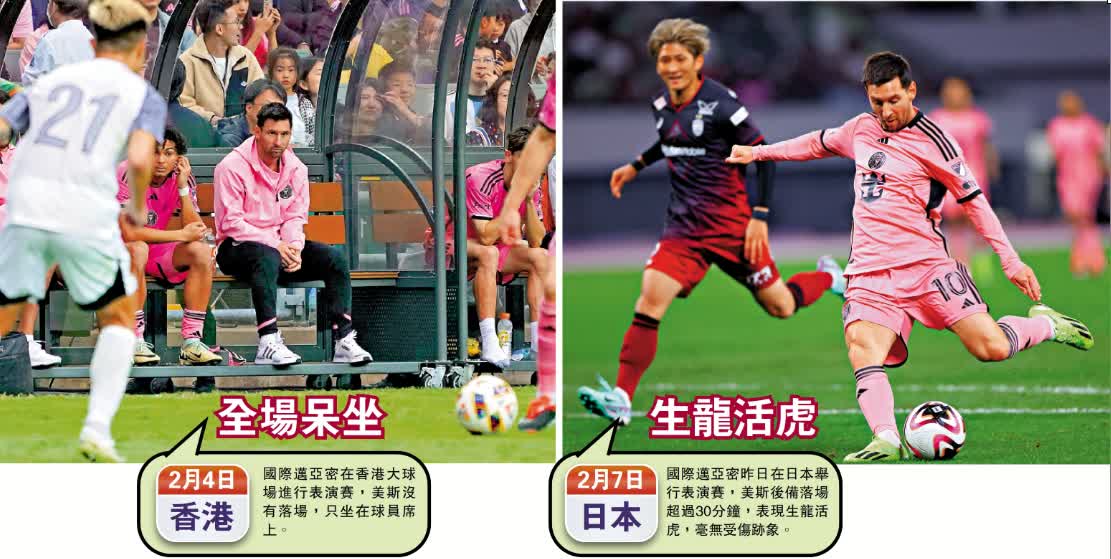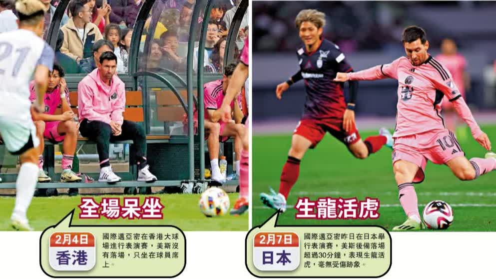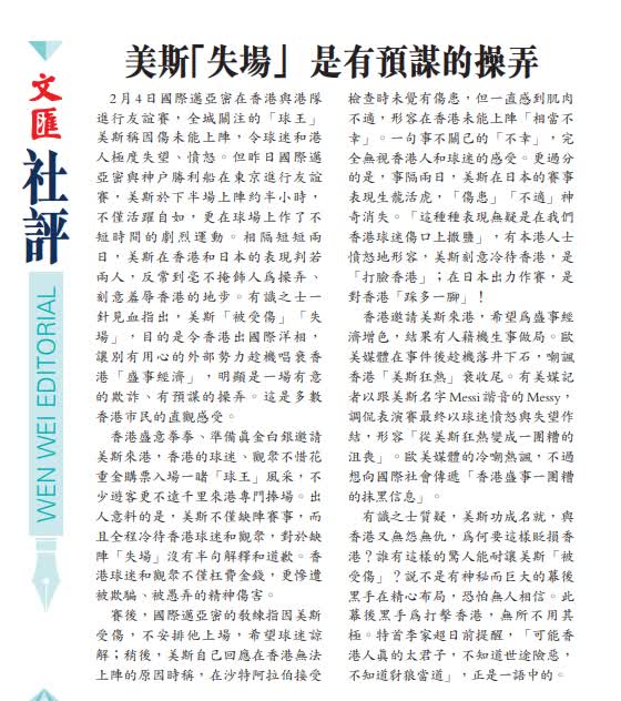 2月4日國際邁亞密在香港與港隊進行友誼賽,全城關注的「球王」美斯稱因傷未能上陣,令球迷和港人極度失望、憤怒。但昨日國際邁亞密與神戶勝利船在東京進行友誼賽,美斯於下半場上陣約半小時,不僅活躍自如,更在球場上作了不短時間的劇烈運動。相隔短短兩日,美斯在香港和日本的表現判若兩人,反常到毫不掩飾人為操弄、刻意羞辱香港的地步。有識之士一針見血指出,美斯「被受傷」「失場」,目的是令香港出國際洋相,讓別有用心的外部勢力趁機唱衰香港「盛事經濟」,明顯是一場有意的欺詐、有預謀的操弄。這是多數香港市民的直觀感受。