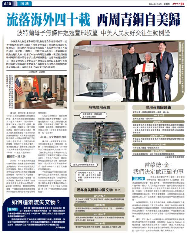 (大公報記者 江鑫嫻)中國流失文物追索和國際間文物返還合作再添新成果。記者7日從國家文物局獲悉,國家文物局近日從美國成功追索被盜流失的一級文物西周青銅器豐邢叔簋,其於1978年出土,屬於國家一級文物。1月28日,文物在專人護送下,搭乘國航班機安全運抵北京,結束了40年的海外漂泊歷程,從居於美國俄勒岡州波特蘭市的母子手上重歸祖國懷抱。文化和旅遊部副部長、國家文物局局長李群表示,豐邢叔簋的回歸是落實中美兩國元首舊金山共識的重要成果,為促成更多文物返還原屬國提供了積極示範,也是中美人民友好交往的生動例證。