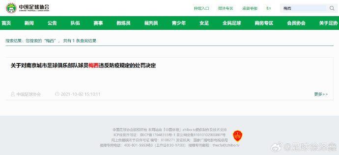 此外,徐澤鑫又稱,「據了解,中國足協已經暫停與阿根廷足協的相關合作,包括阿根廷國家隊。與此同時,中國足協已經刪除了官網關於里奧·梅西(美斯)的所有新聞,此前足協官網是有幾條『球王』的新聞。現在的足協官網,你能搜到的梅西還是2021關於南京城市外援梅西的處罰通知,僅此一條。反而C羅(C朗)的新聞仍然可以搜到。」