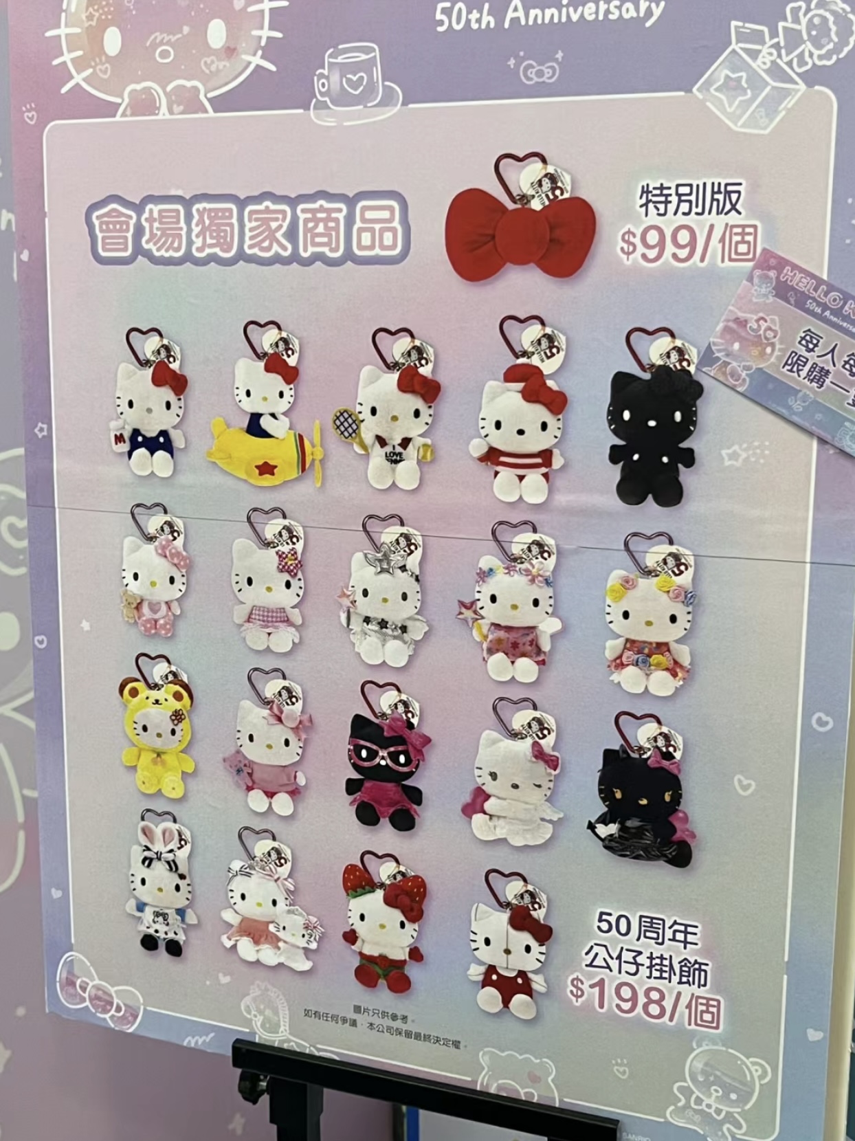 記者苦等一小時,卻只能在第三批入場。今次活動共推出的20款Hello Kitty 50周年限定公仔掛件,今日約有10款出售,惟記者選購時,熱賣款早已被搶購一空,不見蹤影。再看一眼其他人的「戰利品」,則不難發現有人無視隨處可見的「每人每款限購一隻」的提示,將熱賣款式盡數擺入自己籃中。