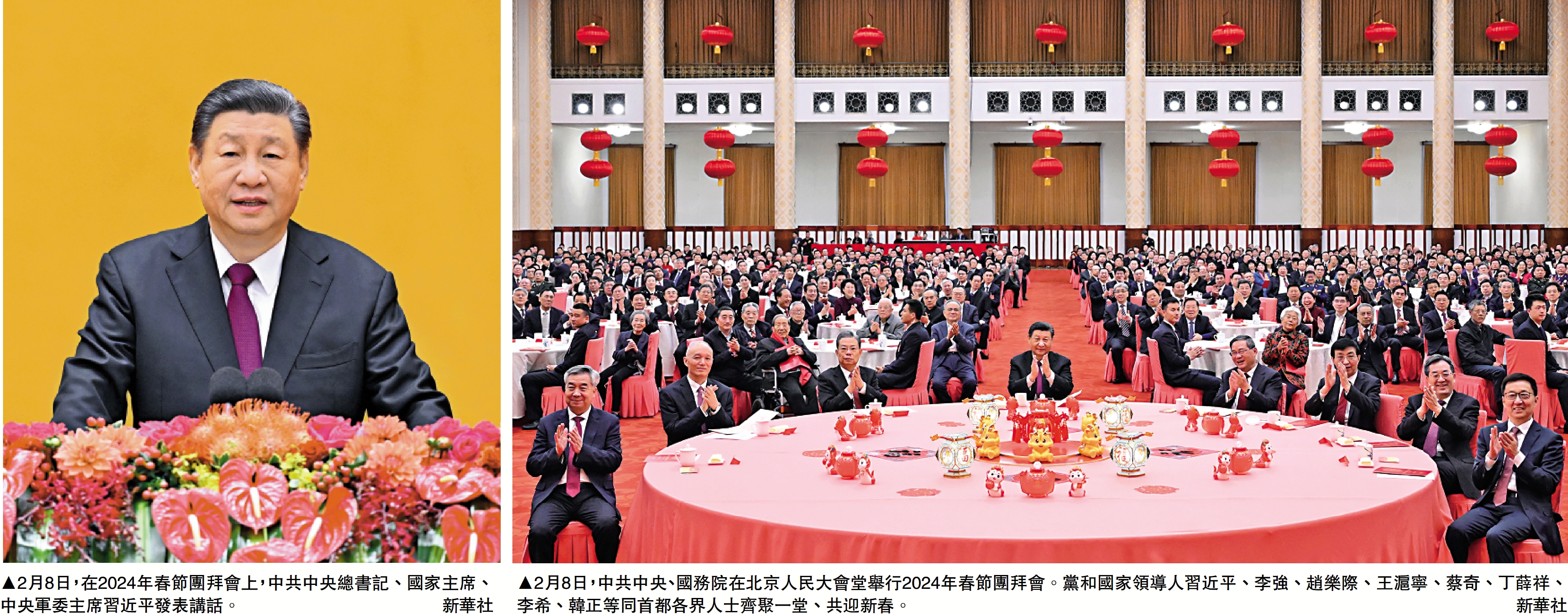 大公報據新華社報道:中共中央、國務院8日上午在人民大會堂舉行2024年春節團拜會。中共中央總書記、國家主席、中央軍委主席習近平發表講話,代表黨中央和國務院,向全國各族人民,向香港特別行政區同胞、澳門特別行政區同胞、台灣同胞和海外僑胞拜年。習近平表示,甲辰龍年,希望全國人民振奮龍馬精神,以龍騰虎躍、魚躍龍門的幹勁闖勁,開拓創新、拚搏奉獻,共同書寫中國式現代化建設新篇章。祝大家身體健康、工作順利、闔家幸福、龍年吉祥!