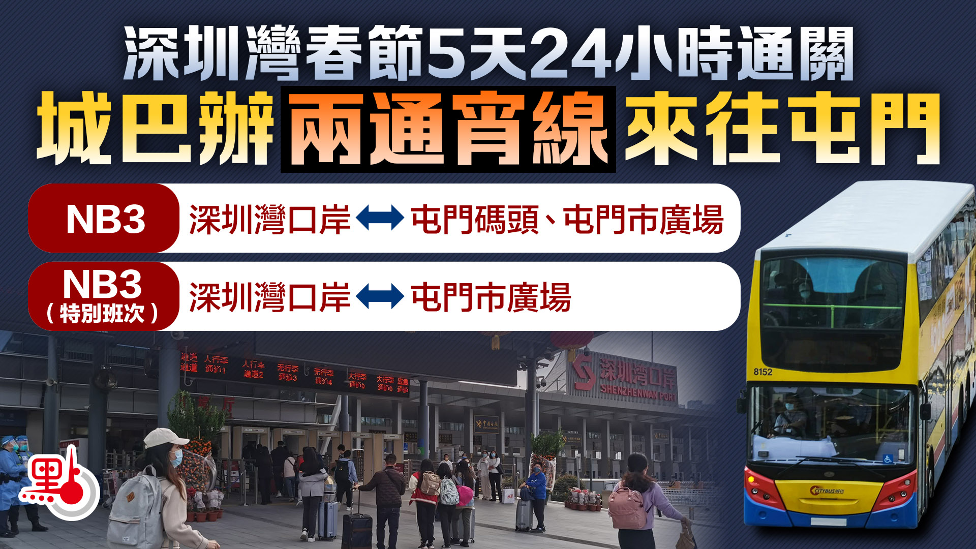 城巴宣布,為配合相關措施,將首次開辦通宵巴士NB3系列路線。NB3號線往返屯門碼頭、屯門市廣場至深圳灣口岸;NB3(特別班次)號線往返屯門市廣場至深圳灣口岸(路線與日間路線B3X相若)。兩條路線聯合班次頻密達30分鐘,城巴將預留額外資源視乎需求適時加密服務。顧客可善用通宵路線N50及N969的轉乘安排,來往九龍油尖旺、中西區及灣仔區至深圳灣口岸,切合大部分市民及旅客的出行需要。