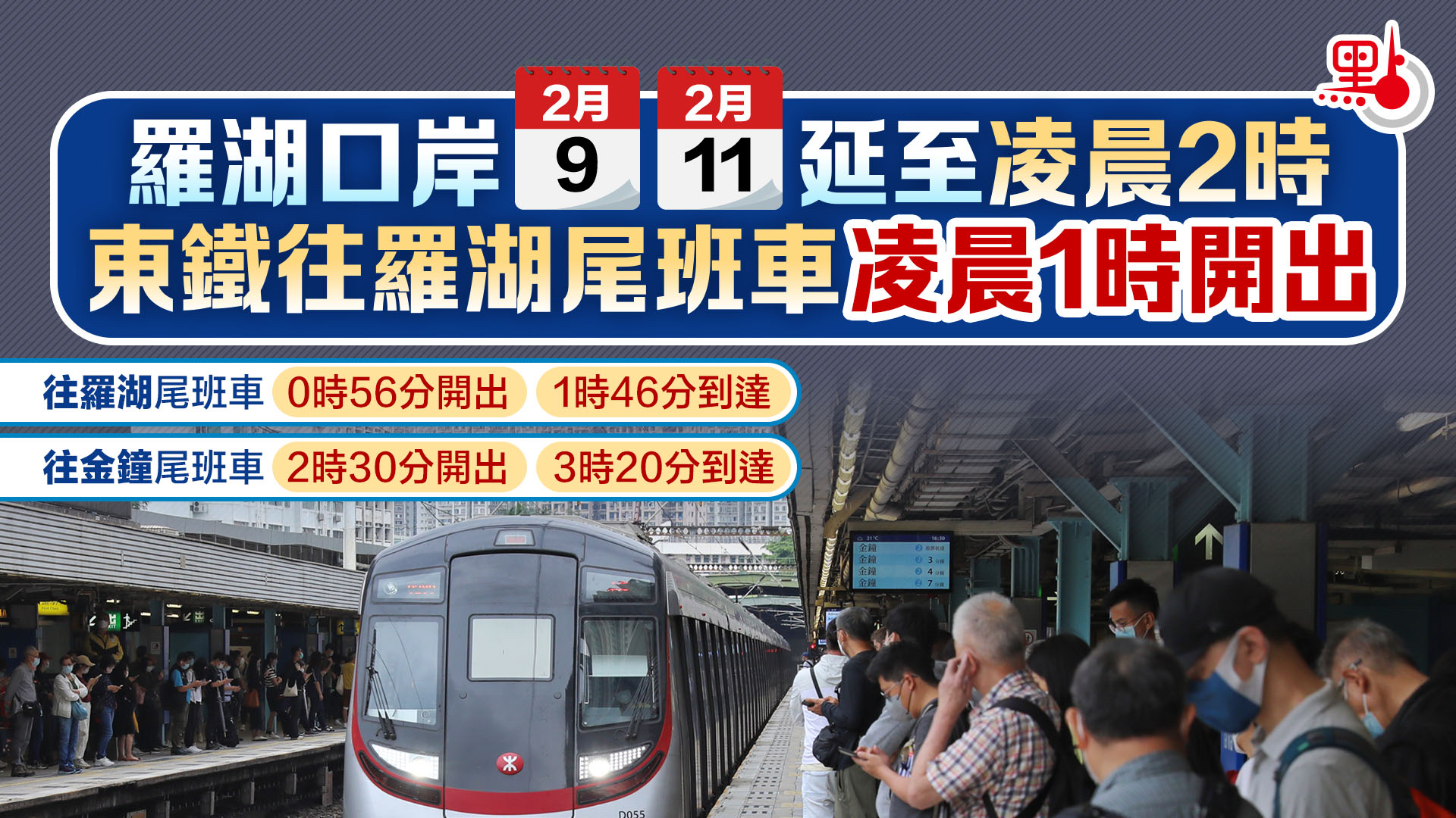 年三十及年初二晚,東鐵綫往羅湖方向的北行尾班車,將於午夜12時56分由金鐘站開出,並於約凌晨1時46分到達羅湖站,即口岸關閉前約14分鐘;該兩晚最後一班由羅湖站開出的東鐵綫往金鐘方向南行尾班車,則會於凌晨2時30分開出(即口岸關閉後約半小時),並於約凌晨3時20分到達金鐘站。