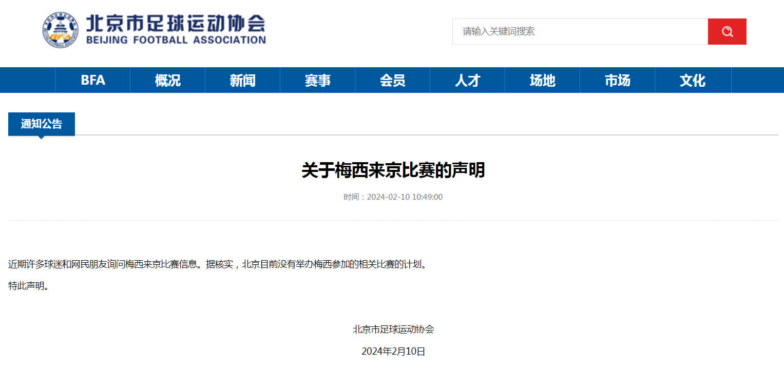 北京市足球運動協會10日發布《關於梅西來京比賽的聲明》:近期許多球迷和網民朋友詢問梅西來京比賽信息。據核實,北京目前沒有舉辦梅西參加的相關比賽的計劃。