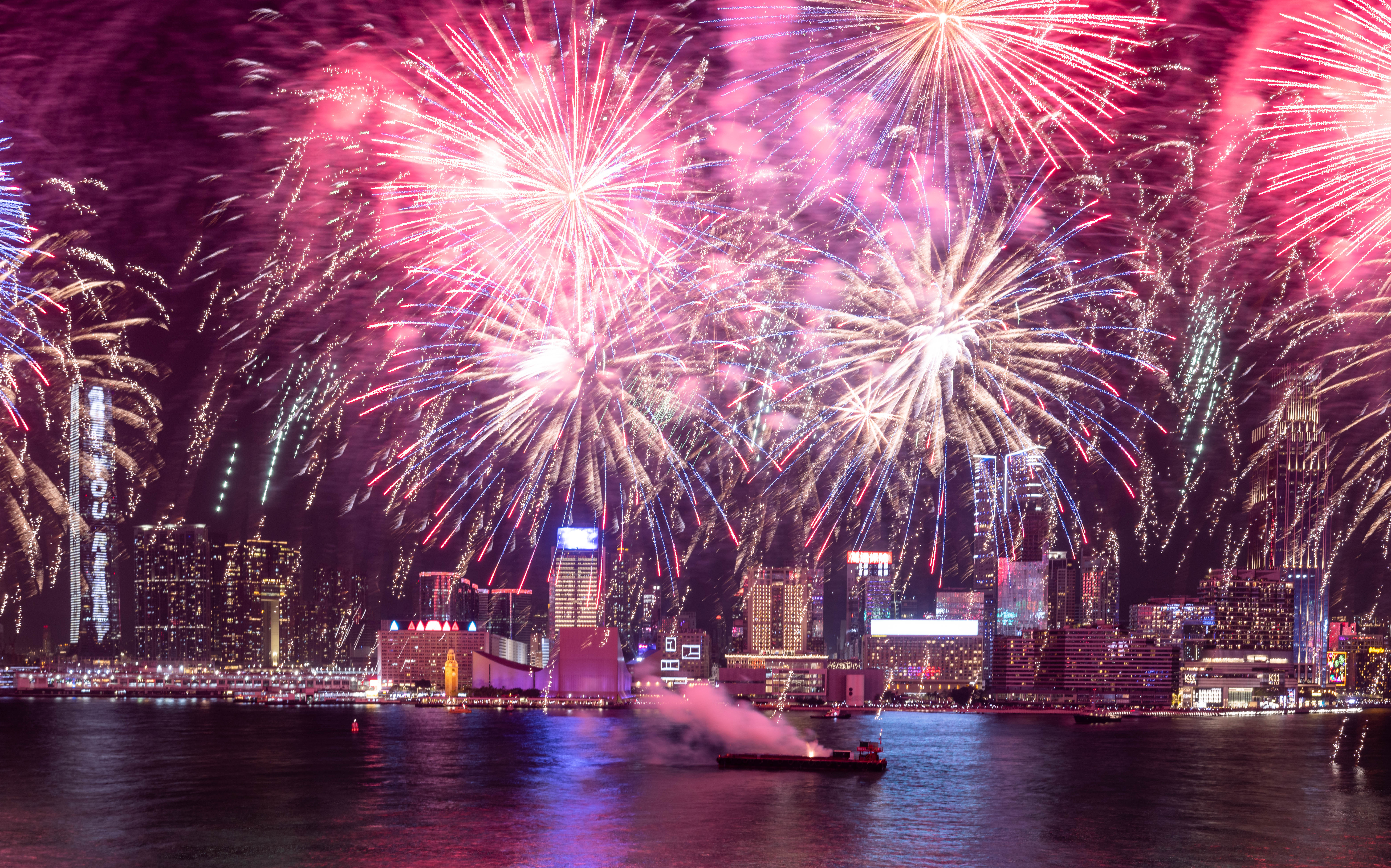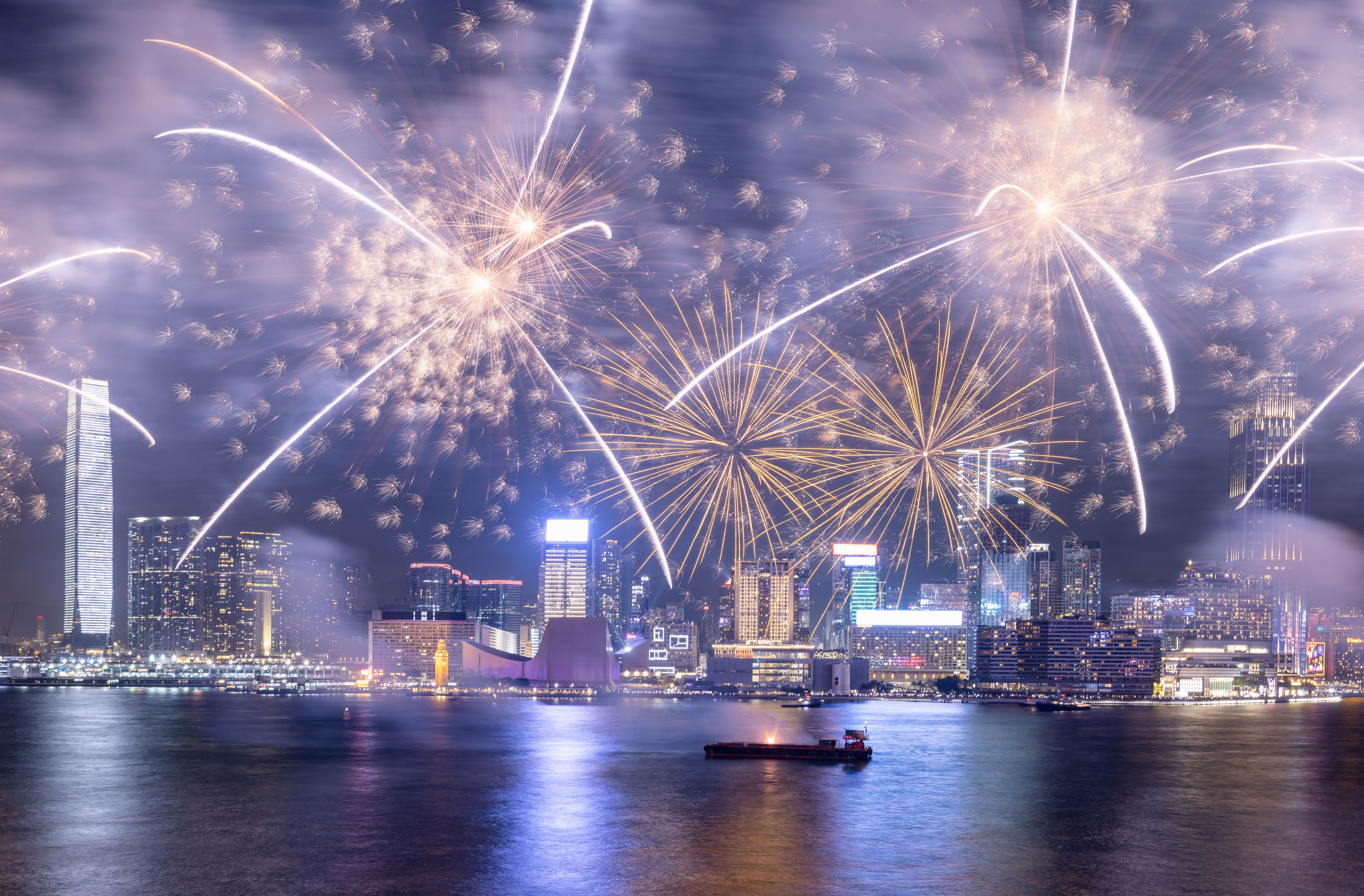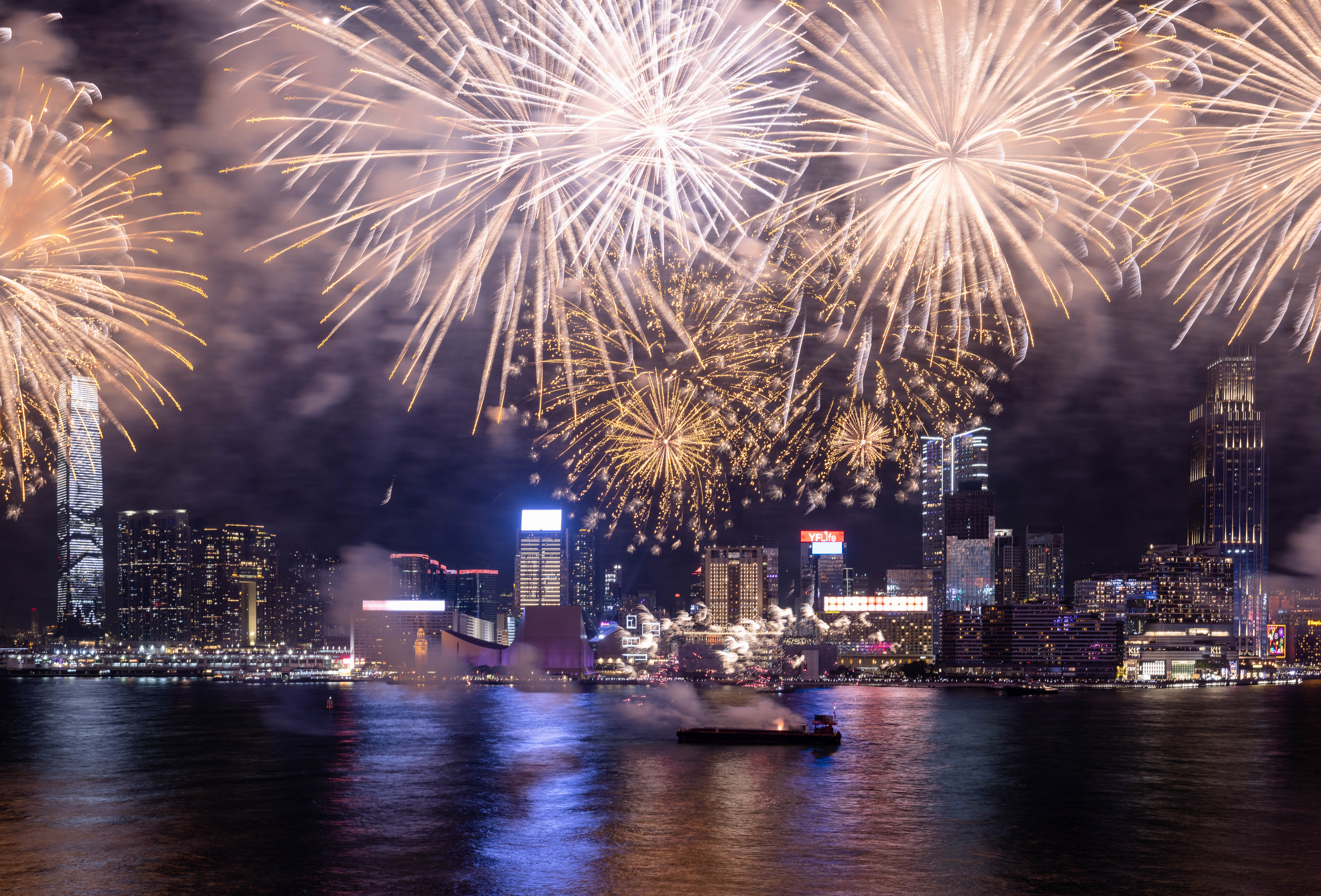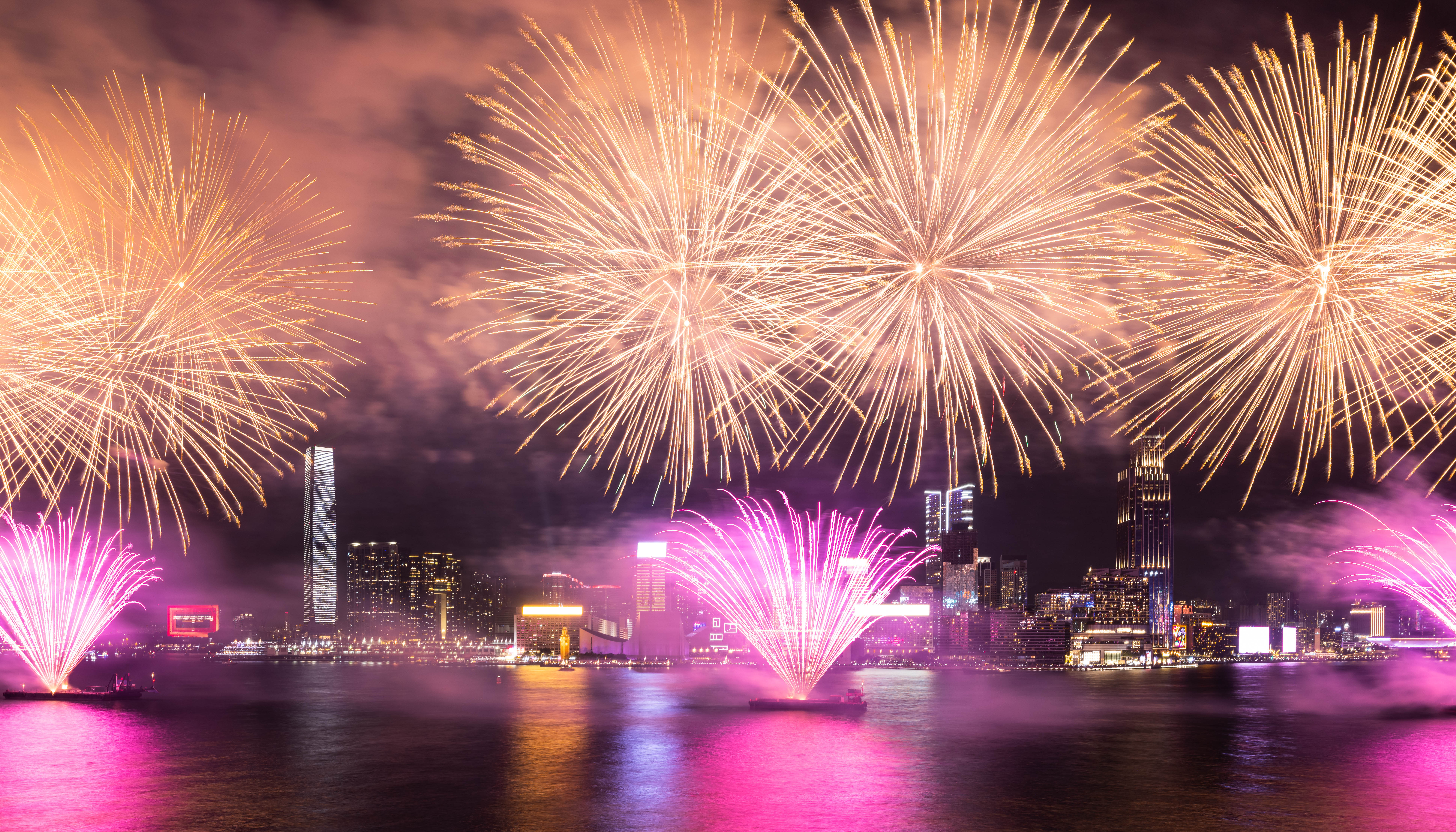 大公文匯全媒體報道,農曆新年煙花匯演今晚(11日)8時在維港上空上演,歷時23分鐘,以「龍年百業旺、盛世中華強」為主題,共分為八幕。匯演動用三艘專業躉船,綻放共23888顆煙花,整體預算達1300萬港幣。煙花匯演的高清大圖來了,快來欣賞!