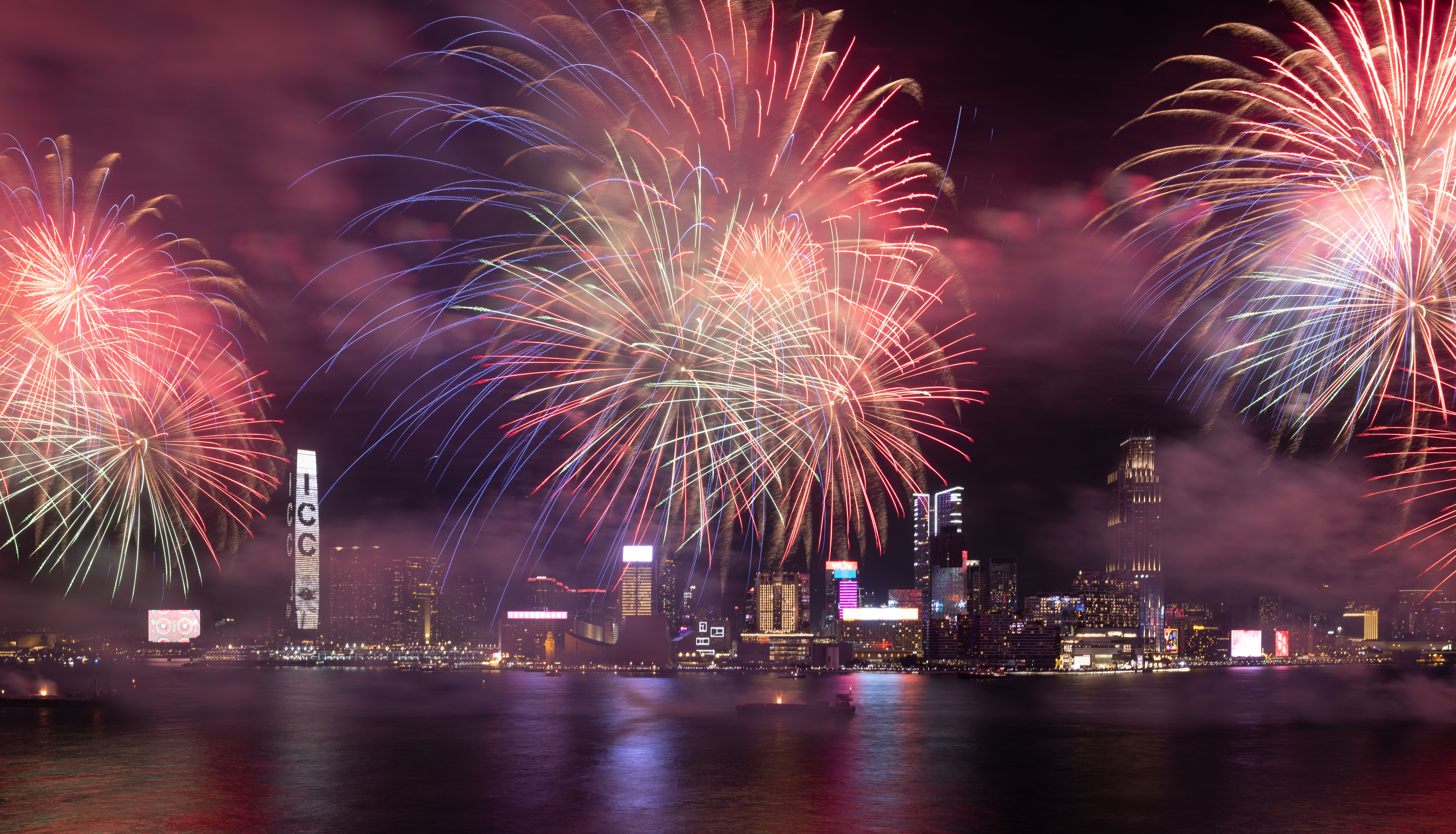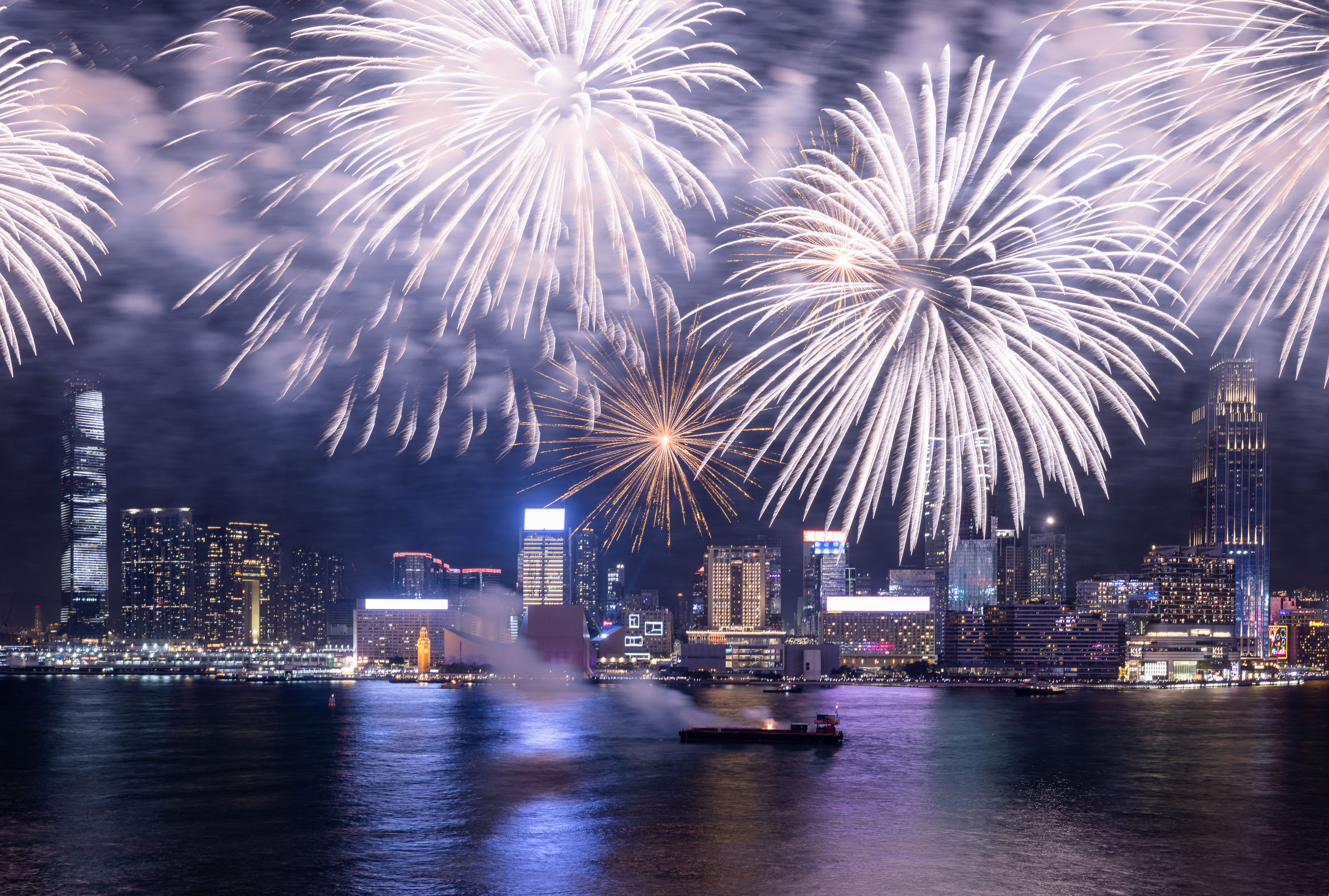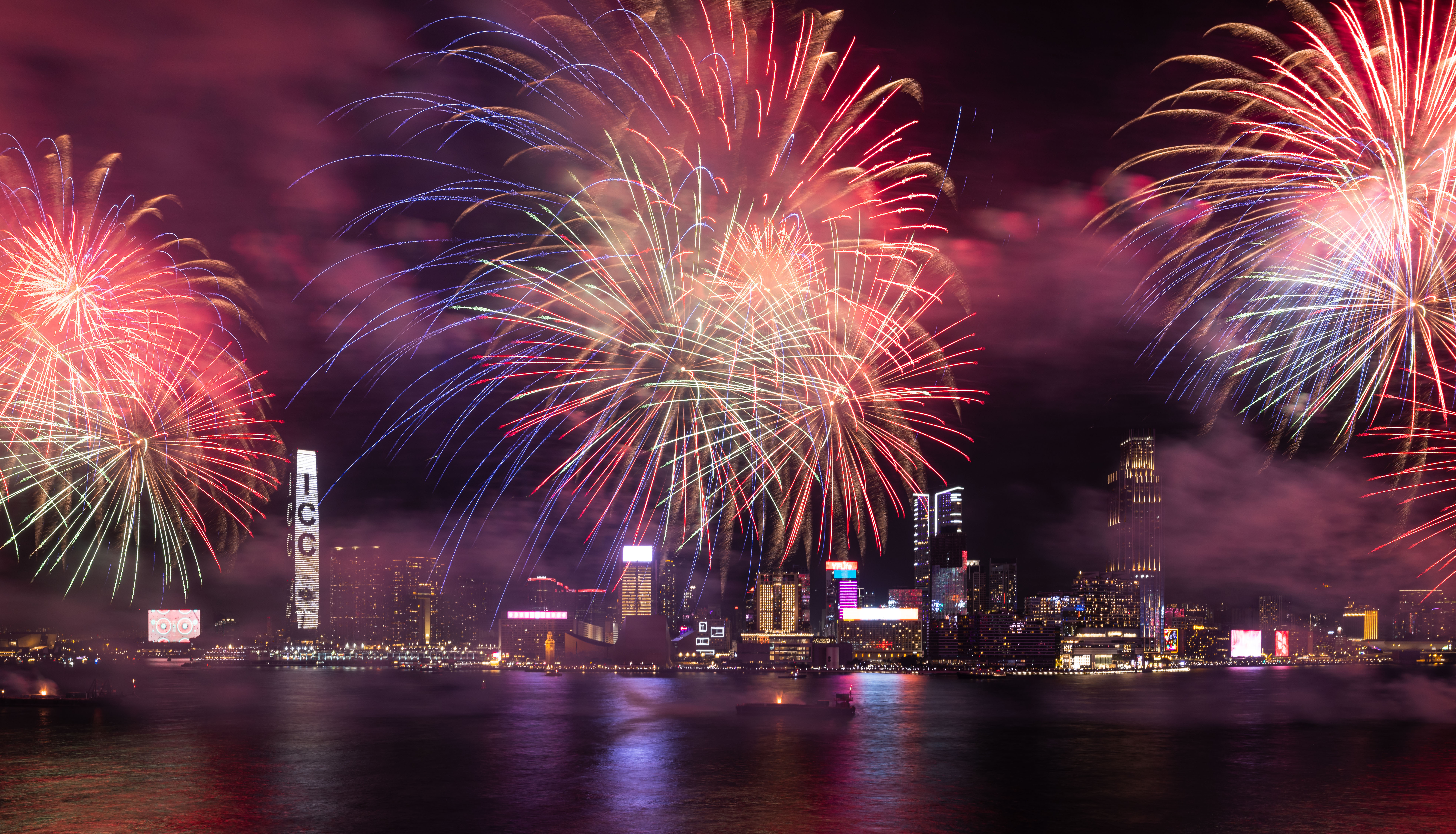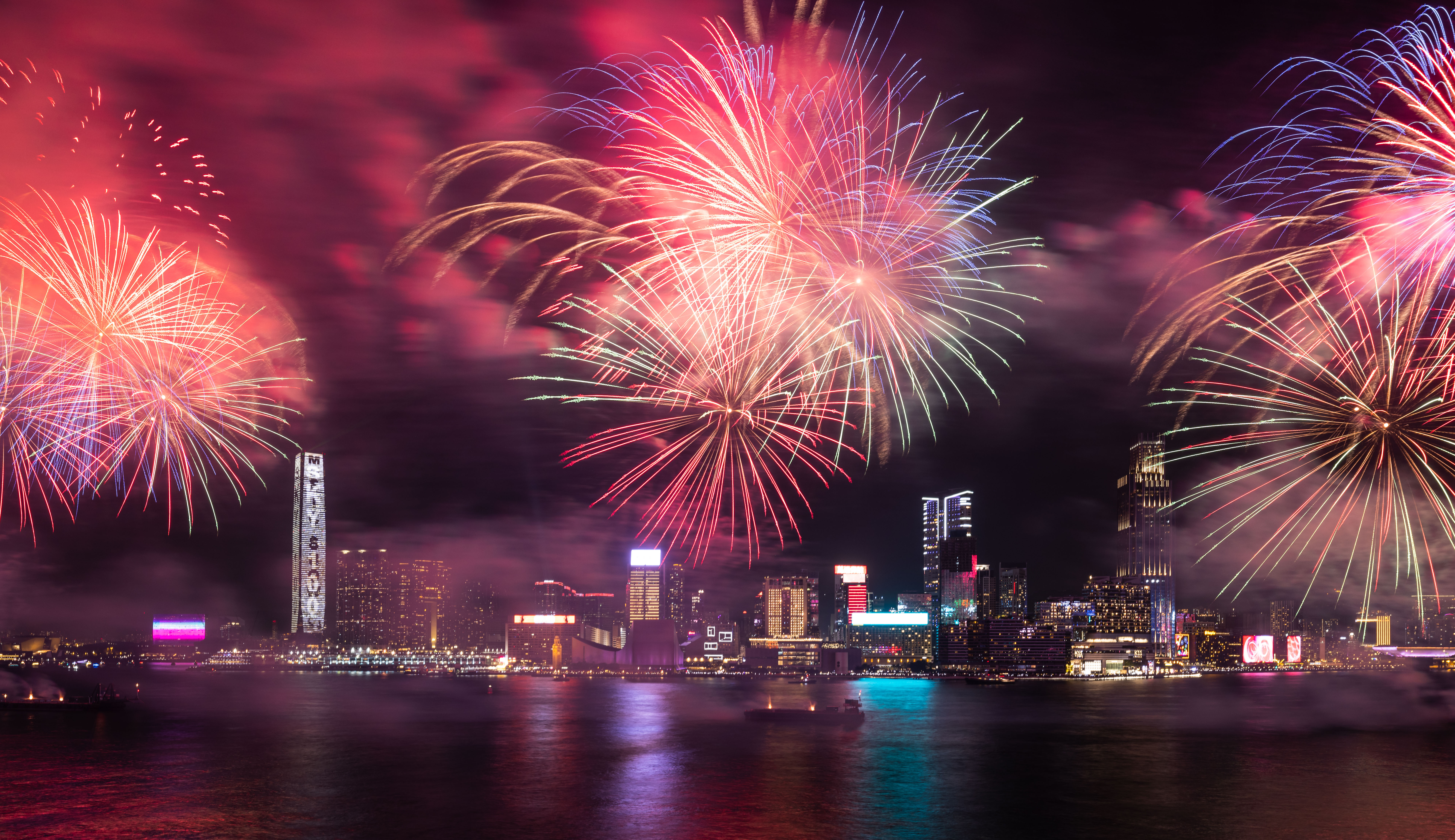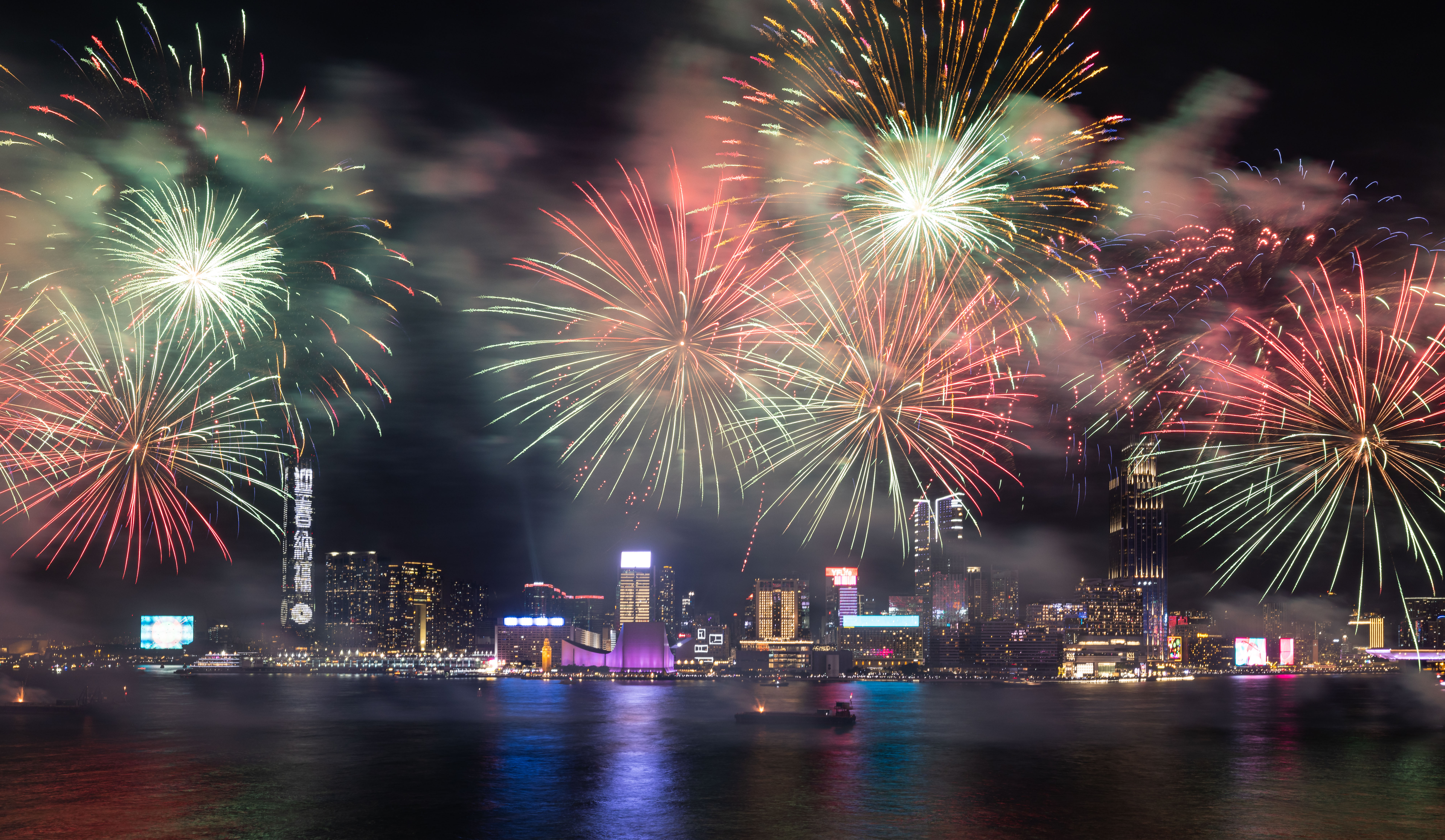 大公文匯全媒體報道,農曆新年煙花匯演今晚(11日)8時在維港上空上演,歷時23分鐘,以「龍年百業旺、盛世中華強」為主題,共分為八幕。匯演動用三艘專業躉船,綻放共23888顆煙花,整體預算達1300萬港幣。煙花匯演的高清大圖來了,快來欣賞!