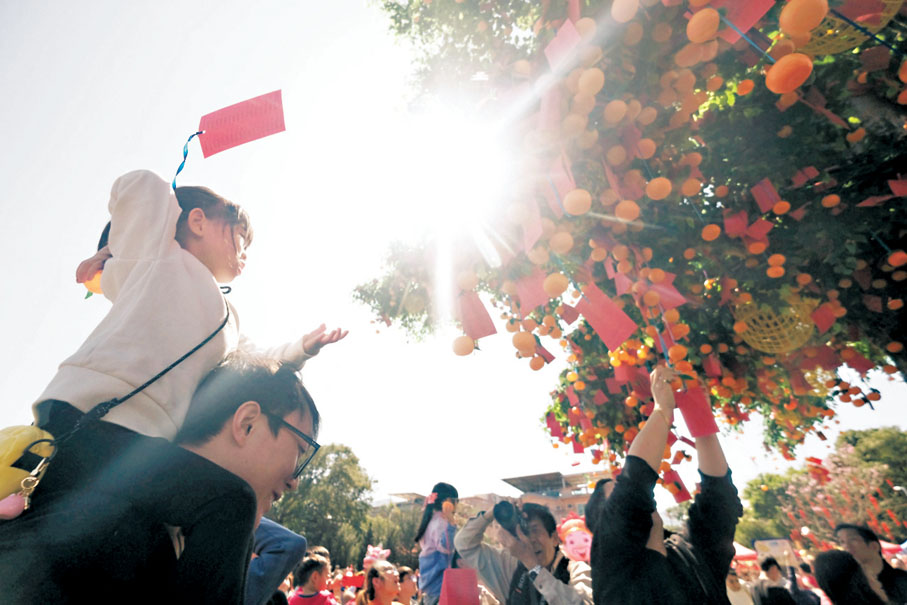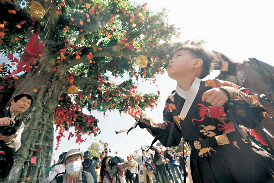 (香港文匯報 記者 郭倩)疫情過去,香港社會逐漸復常,惟在複雜的外圍環境下仍面對不少挑戰。大埔林村是香港著名的許願祈福聖地,昨日到處人山人海,有人在許願樹下拋寶牒,有人在許願池邊放蓮花燈,也有人在天后廟內參拜祈福,每個人臉上都洋溢幸福笑容。健康平安、財源廣進是不少市民的新年願望,最重要的是一家人開心幸福。