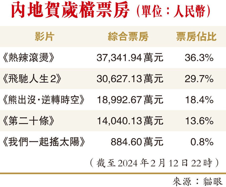 (香港文匯報 記者 石華)儘管不似往年大多數情況有傳統意義上的「大製作」壓陣,但內地春節檔主要影片的出彩陣容與其喜劇元素均展現出不可小覷的號召力,成為新年期間社交平台熱搜「霸榜」題材。據燈塔專業版數據,截至2月12日15時,2024春節檔新片總票房(含點映及預售)破30億元人民幣。在深圳院線,不少港人做足功課有備而來,指內地出品影視作品質素越來越高,即使不靠重磅明星「壓陣」,劇本情節也足夠吸引,追一場內地賀歲片電影成為不少港人的「新年俗」。