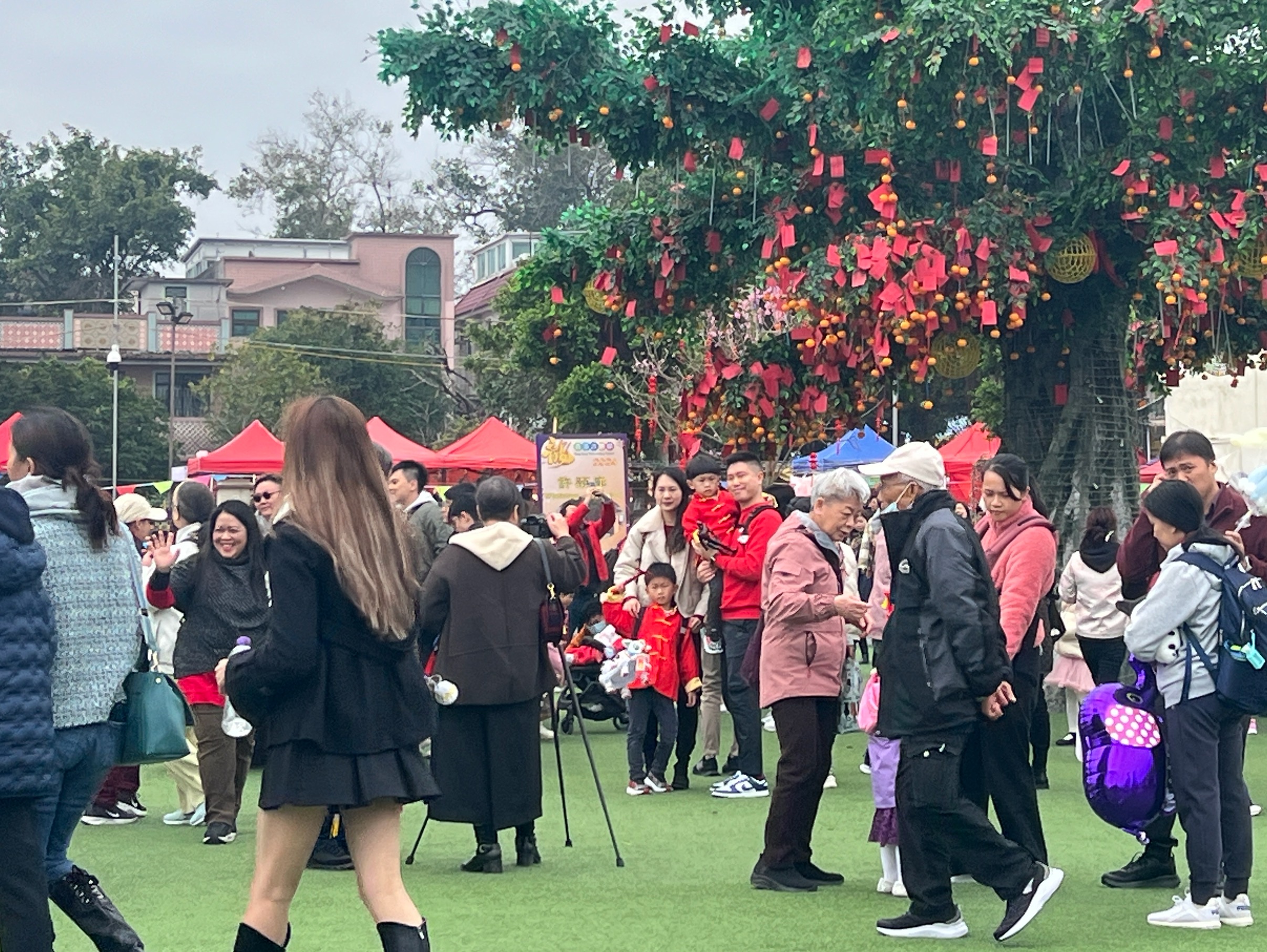大公文匯全媒體報道,今日(13日)是農曆正月初四,林村許願廣場吸引大批市民及旅客拋牒祈福。警方表示,林村附近社山公眾停車場已於下午5時半關閉,呼籲前往林村許願夜市人士乘搭公共交通工具。