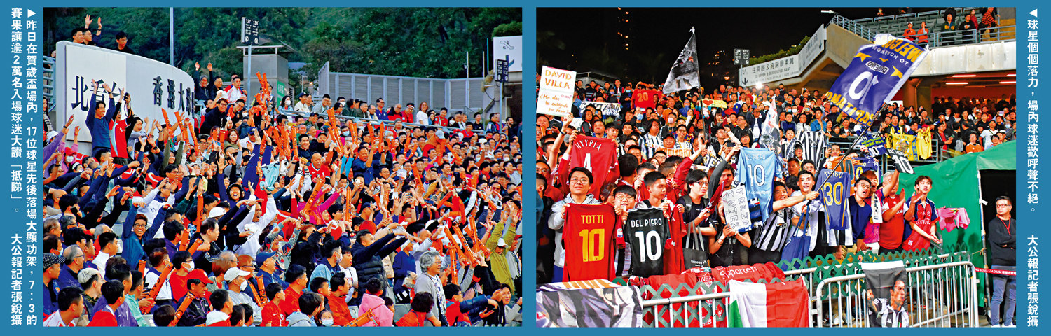 (大公報 記者 馮京)美斯缺陣事件無礙世界足球名宿來港獻技的熱誠,更無損香港舉辦盛事的信心,賀歲盃「世界明星隊」和「香港明星隊」以「十全十美」的入球回饋球迷,全場歡呼聲此起彼落。