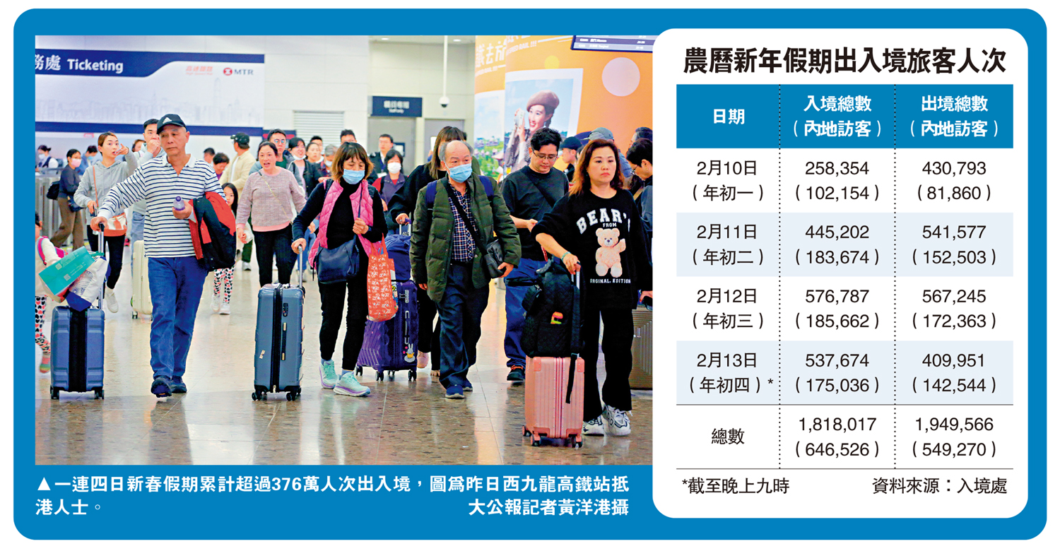 入境處早前預計,今個農曆新年長假期(年三十至年初八),將有超過750萬人次出入境,八成經各陸路口岸進出。入境處數據顯示,由年三十至年初三,累計逾376萬人次出入境,回復至疫情前水平。當中,訪港旅客人次累計逾63萬,當中內地旅客佔近九成。昨日是長假期的一半,也是四日公眾假期的最後一天,各口岸迎來入境高峰期,截至昨晚九時,約有94萬人次出入境。