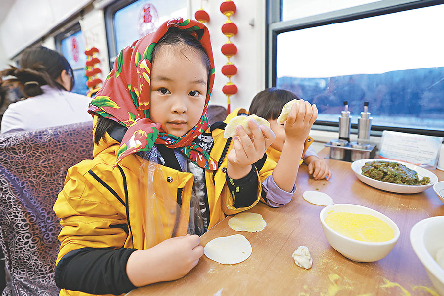 「一路上,我們還給孩子們講解了開發大興安嶺、開墾北大荒的小故事,給他們介紹東北民俗風情、本地的物產特產,還有最受他們歡迎的東北話教學。」穆山山說,在列車員和老師們手把手的教學下,孩子們品嘗到了自己包的東北特色酸菜餡餃子。
