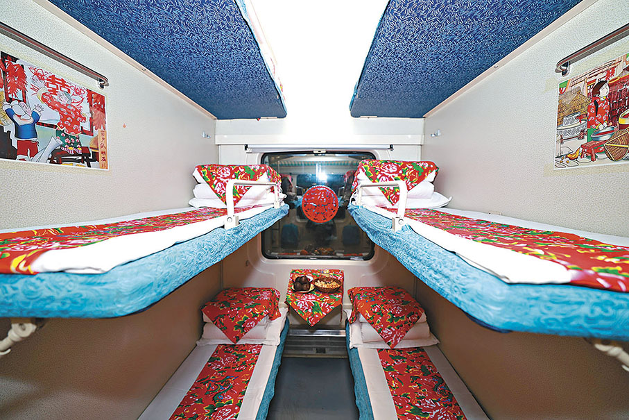 「在車上大家玩得很盡興,而且到了睡覺時間還興致不減。有不少南方遊客感慨自己的鋪位太漂亮,不忍心上去破壞它,就一直在下面的摺疊椅上坐着,怎麼拍照都拍不夠。」 齊齊哈爾客運段列車員李偉說,臥鋪車廂的備品都是全新的,在每個鋪位旁邊的隔斷板上,都貼着喜慶的年畫和東北剪紙藝術品,乘客都非常喜愛。
