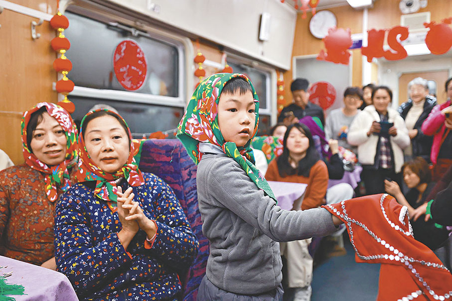 「有的南方乘客跟我們這班列車坐下來,還學到了不少東北才藝。」列車員李偉說,在餐車車廂,專門準備了彩紙和剪刀,讓乘客體驗東北剪紙剪窗花,有手巧的南方乘客還跟着東北二人轉演員學會了轉手絹。
