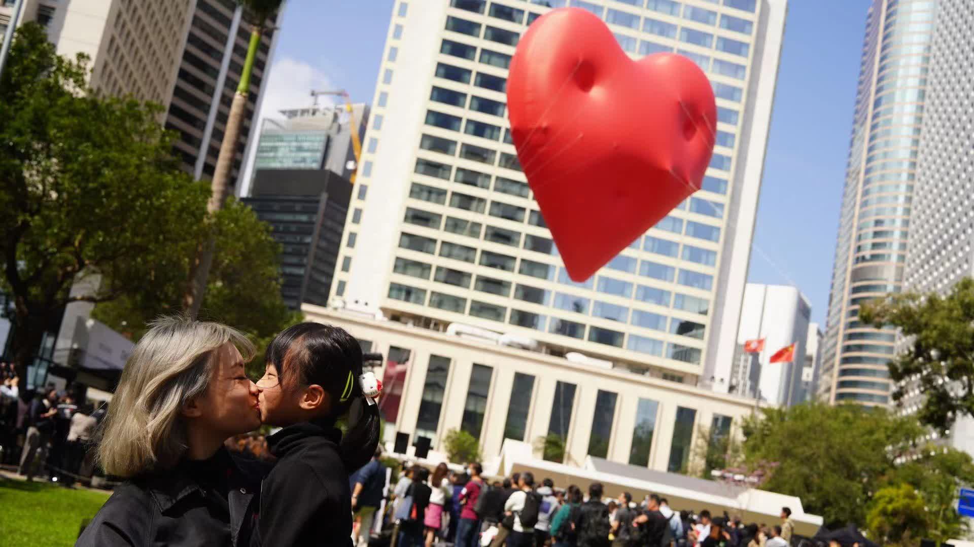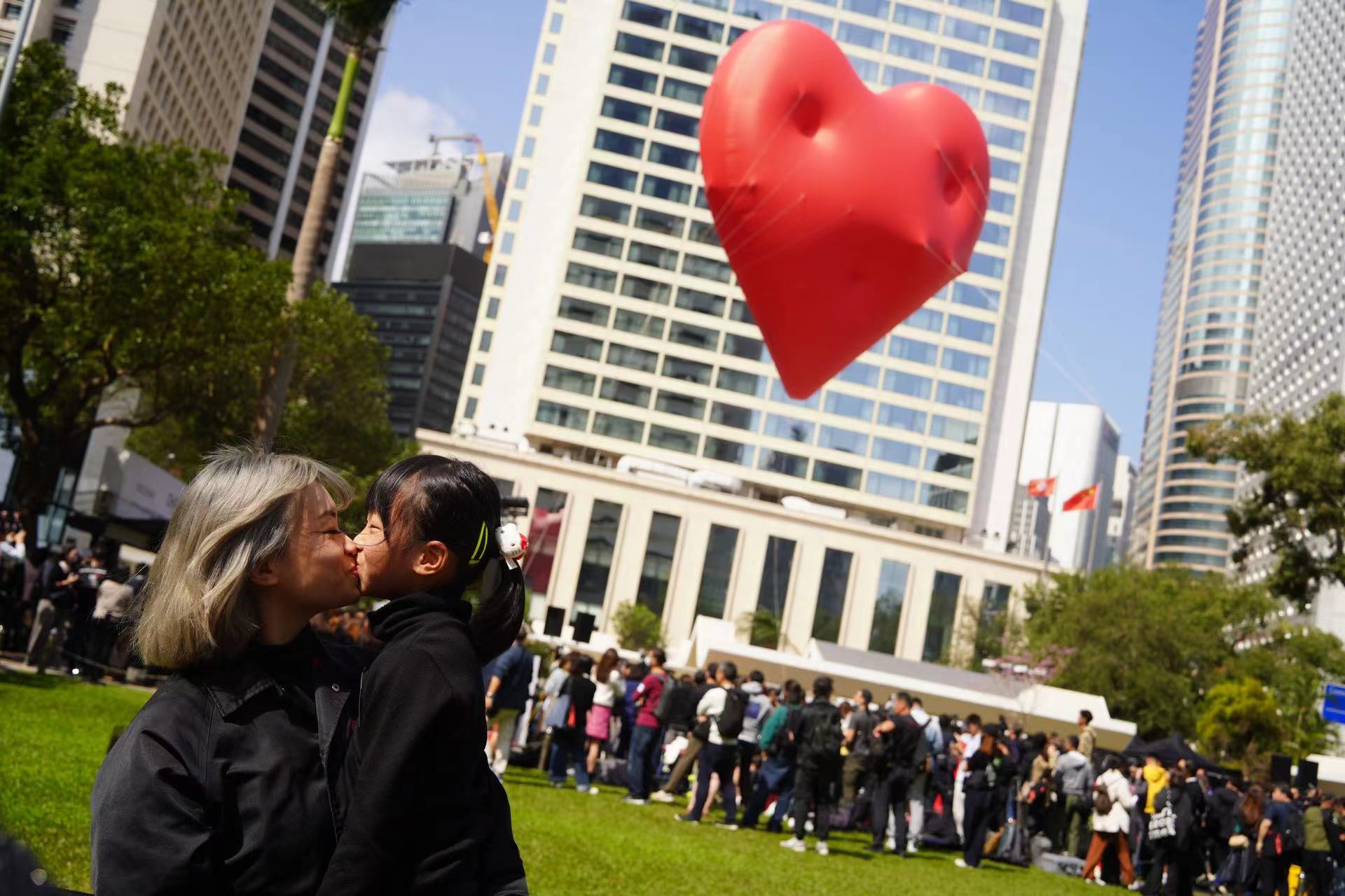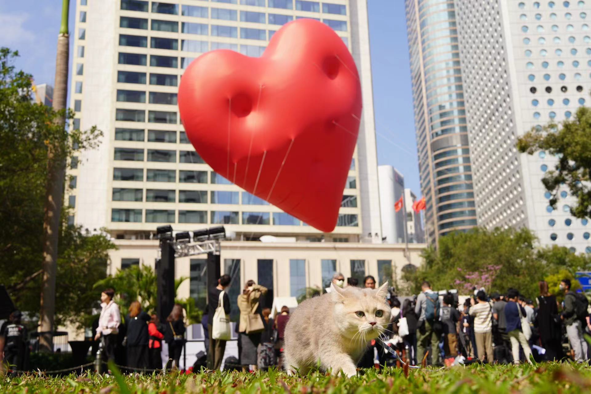 大公文匯全媒體報道,適逢西方情人節,由香港設計中心策展及呈獻的公共設計及藝術項目「Chubby Hearts Hong Kong」於今日(14日)正式開展。即日起至24日期間,直徑達12米的巨型飄浮紅心會一連11日於中環皇后像廣場花園亮相,每日展出時間為下午1時至晚上9時。