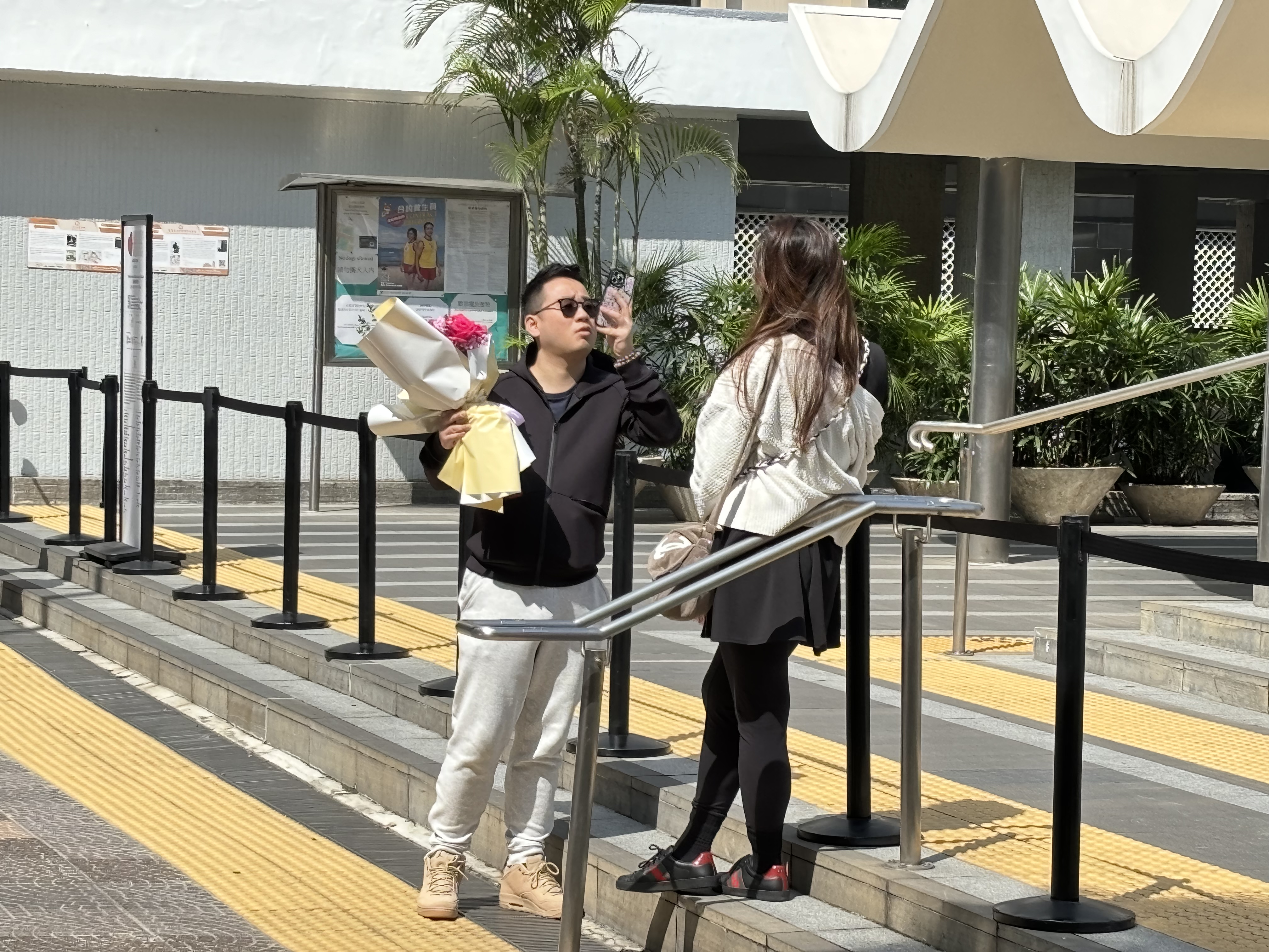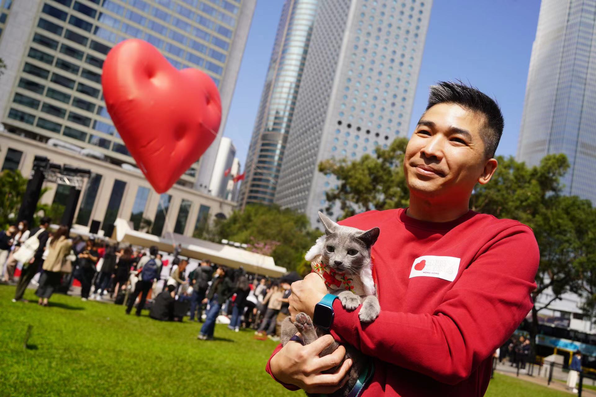 巨型紅心裝置升高後,現場有大批市民遊客,使出百般POSE,搶先與Chubby Hearts合照打卡。更有市民帶毛孩來一道合照,其樂融融。
