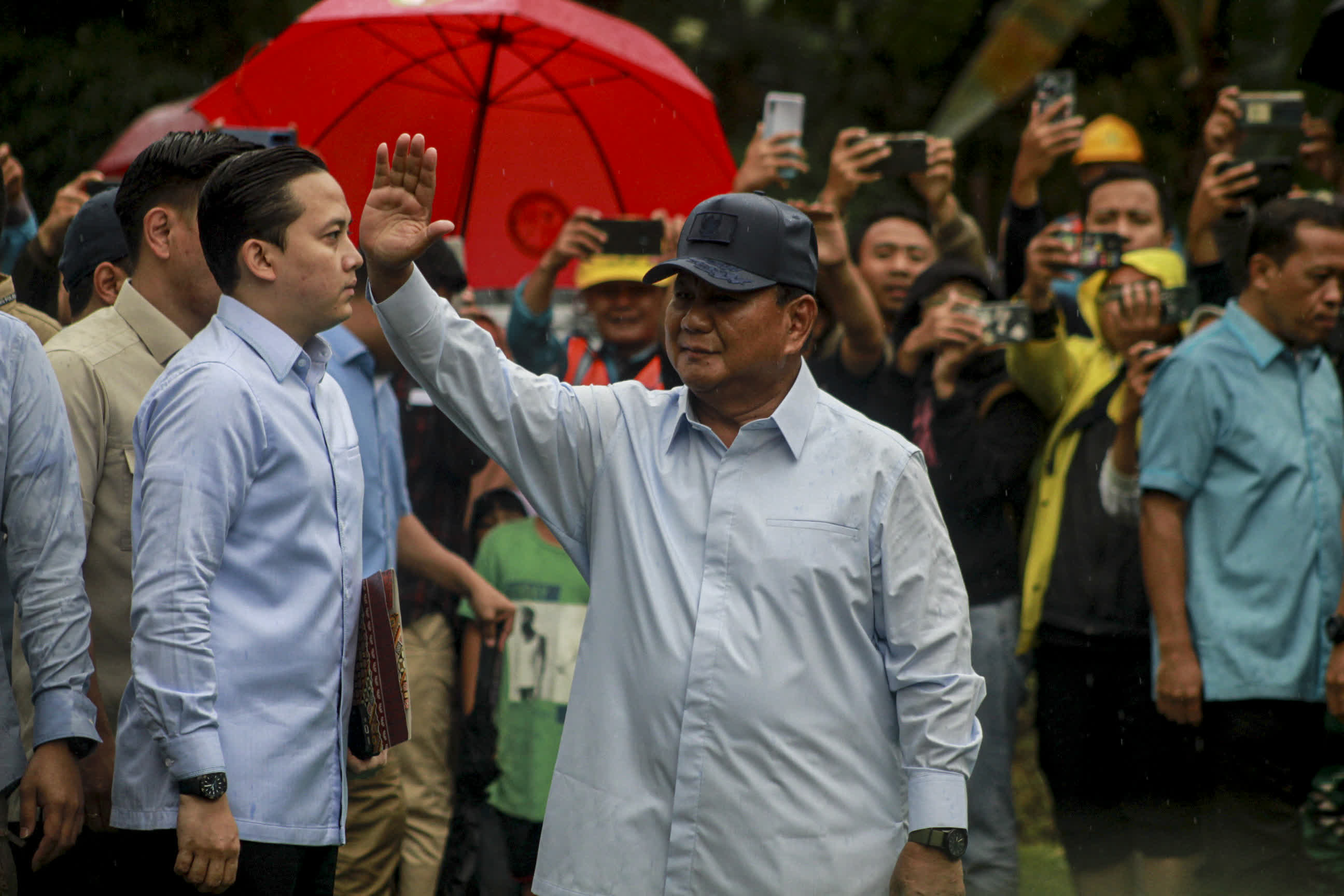 2月14日,印度尼西亞現任國防部長普拉博沃在位於茂物的第33號投票站向人們致意。(新華社)