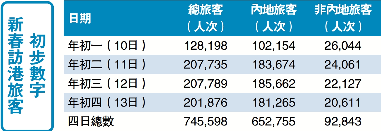(大公報 記者 戴靜文)新春四日長假期剛結束,政府昨日公布,年初一至年初四期間,訪港旅客初步估計約75萬人次,當中65萬是內地旅客,超越2018年同期的64萬人次。這四天共有約1200個內地入境團到港,涉及旅客約40500人次,內地團數目及參團總人次均超過疫情前春節黃金周同期水平。旅遊發展局表示,1月份初步訪港旅客數字約為383萬人次,復甦勢頭持續。