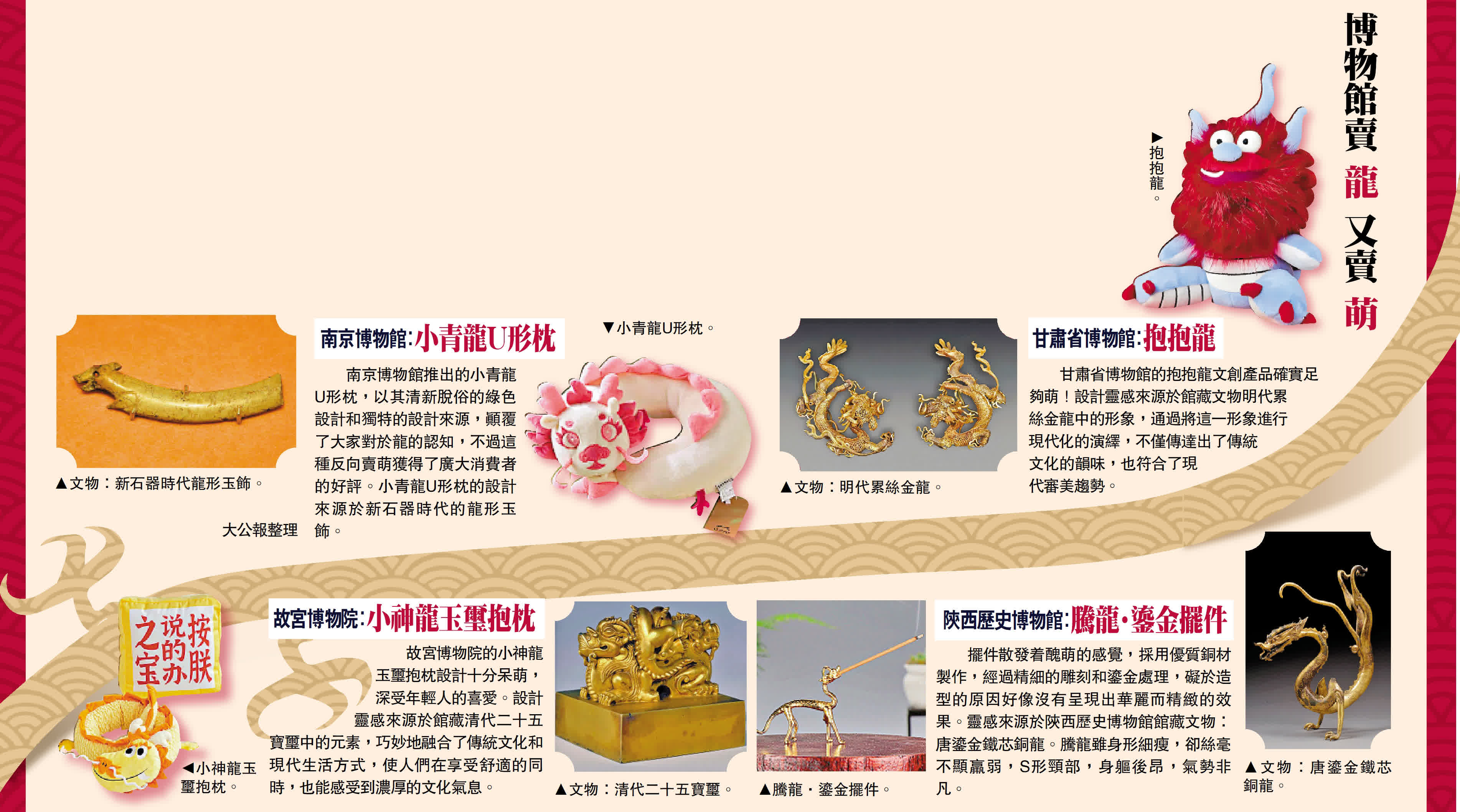 「2024龍年文創」登頂淘寶熱搜榜單第一,龍年記事本「神龍本」「有龍則靈」枱曆等成為熱搜商品。農曆龍年各家博物館也相繼推出了文創產品:瀋陽博物館推出呆萌姿態的祥龍抱枕玩偶,昵稱「水龍頭」;蘇州博物館推出可以任意凹造型的龍萌萌毛絨包掛;國家博物館有「蠢萌」的五彩龍紋徽章以及造型源自紅山玉龍的毛絨頸枕……而不少看了「安利帖」(推薦帖子)的網友都紛紛留言詢問如何購買。