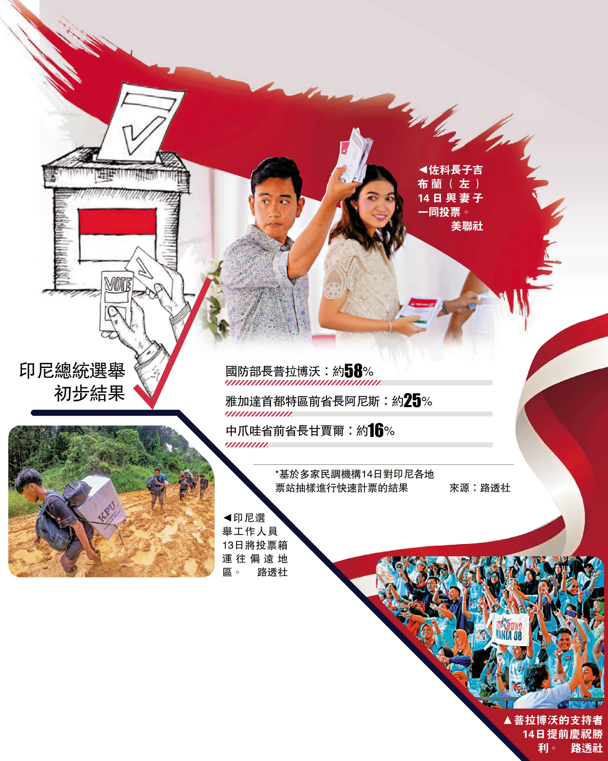 大公報綜合美聯社、《聯合早報》、路透社、《華爾街日報》報道:印度尼西亞14日舉行大選。根據多家民調機構的抽樣快速計票結果,印尼國防部長普拉博沃和現總統佐科長子吉布蘭的競選組合得票率約為58%,有望直接勝出,分別當選正副總統。普拉博沃14日晚宣布勝選,但呼籲支持者保持冷靜,等待官方公布計票結果。投票日當天,印尼首都雅加達等地因暴雨出現洪水,部分票站推遲開放,但選舉整體未受到嚴重影響。