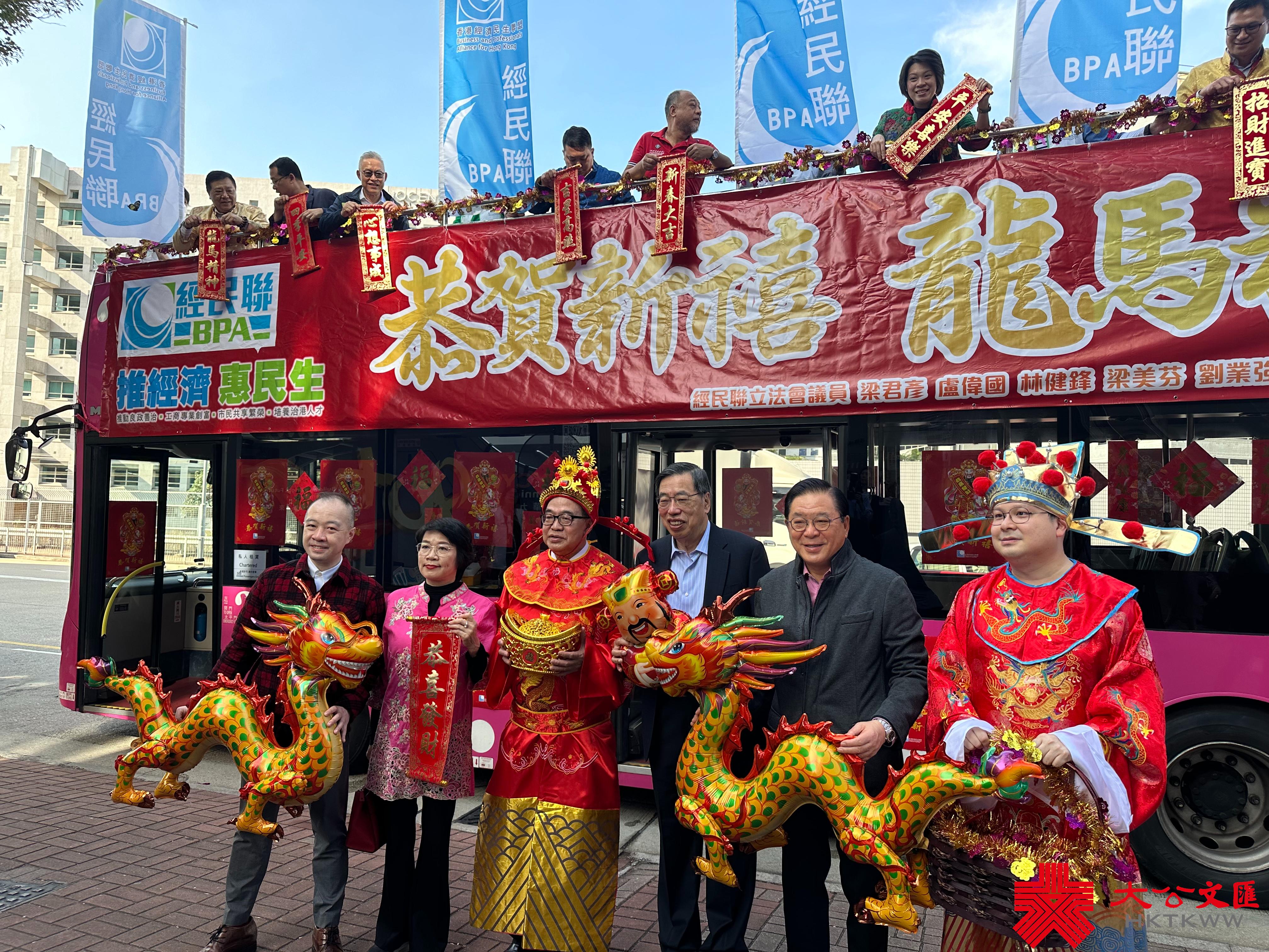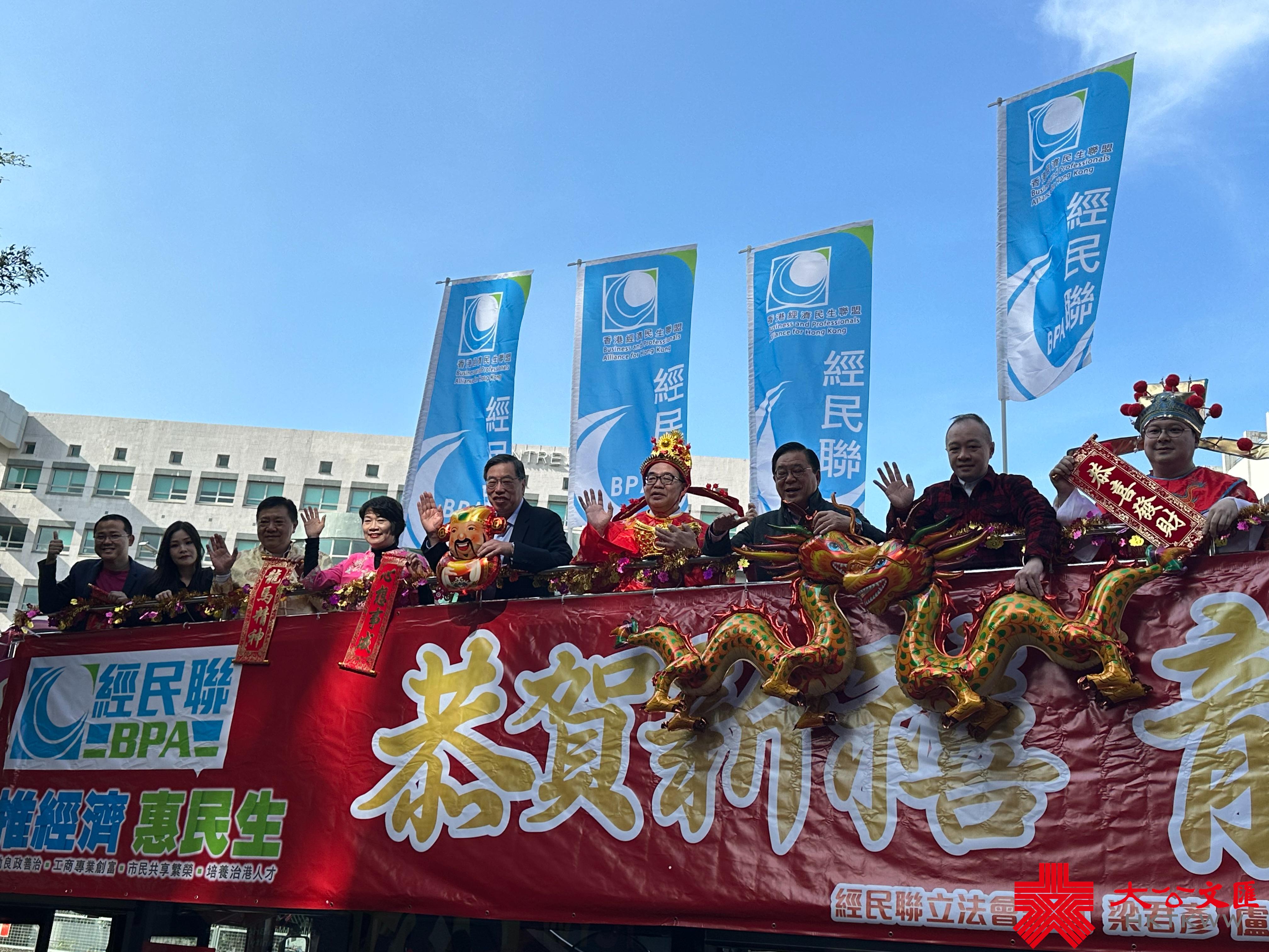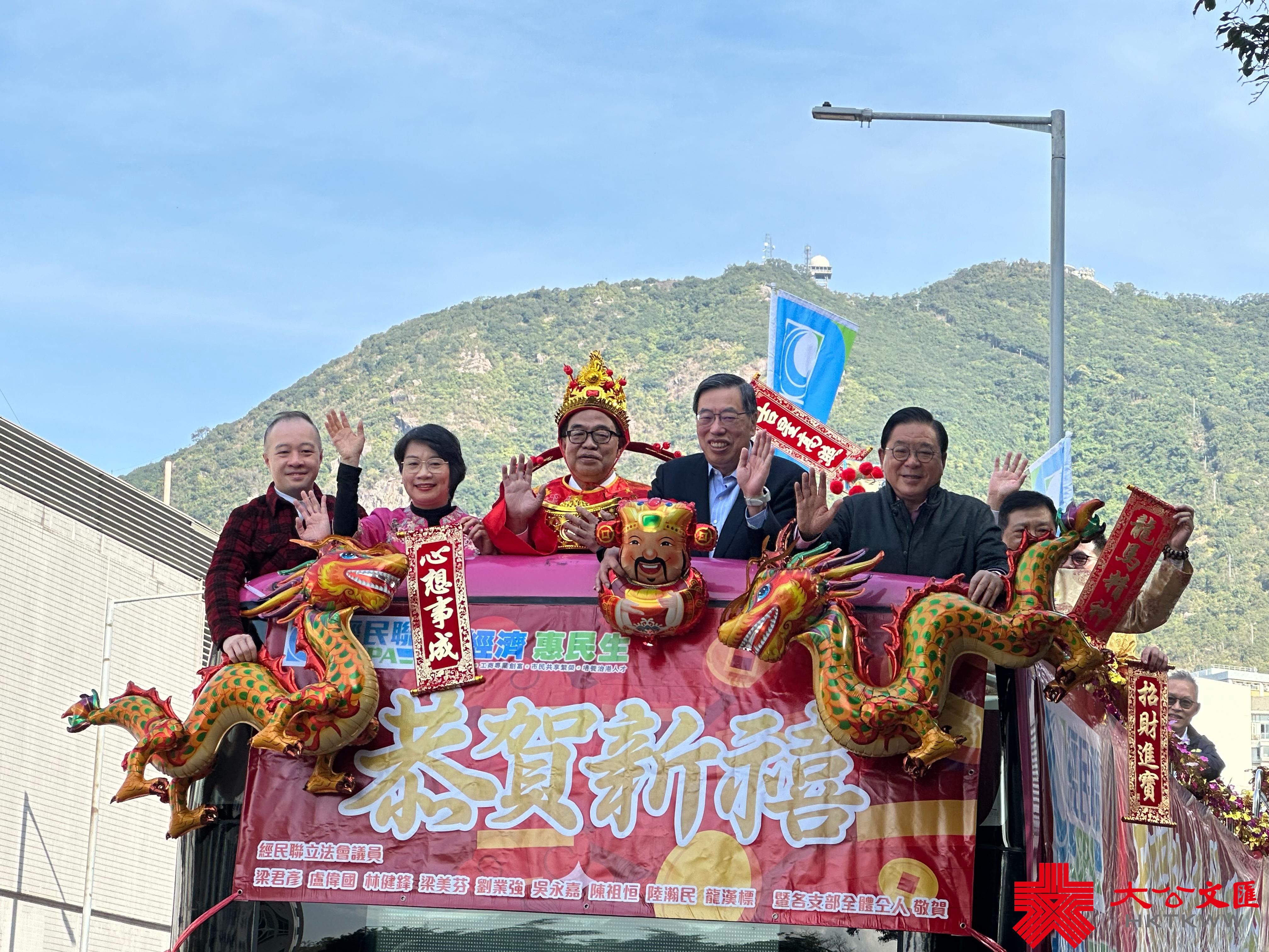 大公文匯全媒體報道,今日(15日)是大年初六。經民聯上午舉行花車巡遊團拜活動,經民聯立法會議員、區議員乘坐賀年花車到各區向街坊拜年,祝願全港市民龍年行大運,各行各業鯉躍龍門,香港經濟民生開創新氣象。經民聯榮譽主席梁君彥、主席盧偉國、副主席梁美芬等出席活動。
